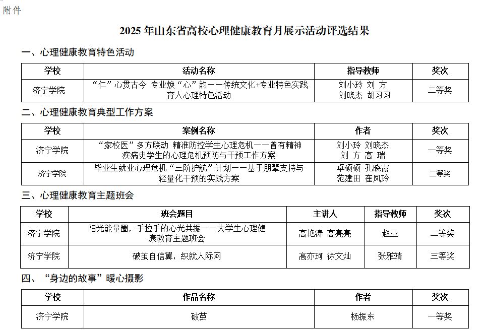 在山东省高校心理健康教育月展示活动,我校多项作品再获佳绩。学生工作处刘小玲、刘方、刘晓杰、胡习习指导的《“仁”心贯古今 专业焕“心”韵——传统文化+专业特色实践育人心理特色活动》荣获心理健康教育特色活动二等奖。刘小玲、刘晓杰、刘方、高瑞撰写的《“家校医”多方联动 精准防控学生心理危机——曾有精神疾病史学生的心理危机预防与干预工作方案》荣获心理健康教育典型工作方案一等奖,计算机科学与工程学院卓硕硕、孔晓霞、范建田、崔凤玲撰写的《毕业生就业心理危机“三阶护航”计划——基于朋辈支持与轻量化干预的实践方案》荣获心理健康教育典型工作方案二等奖。在心理健康主题班会评选中,物理与电子工程学院高艳涛、高亮亮同学的作品《阳光能量圈,手拉手的心光共振——大学生心理健康教育主题班会》(指导教师:赵亚)荣获二等奖;人文与传播学院高亦珂、徐文灿同学的作品《破茧自信翼,织就人际网》(指导教师:张雅靖)荣获三等奖。此外,教师教育学院杨振东同学的作品《破茧》在“身边的故事”暖心摄影中荣获一等奖。