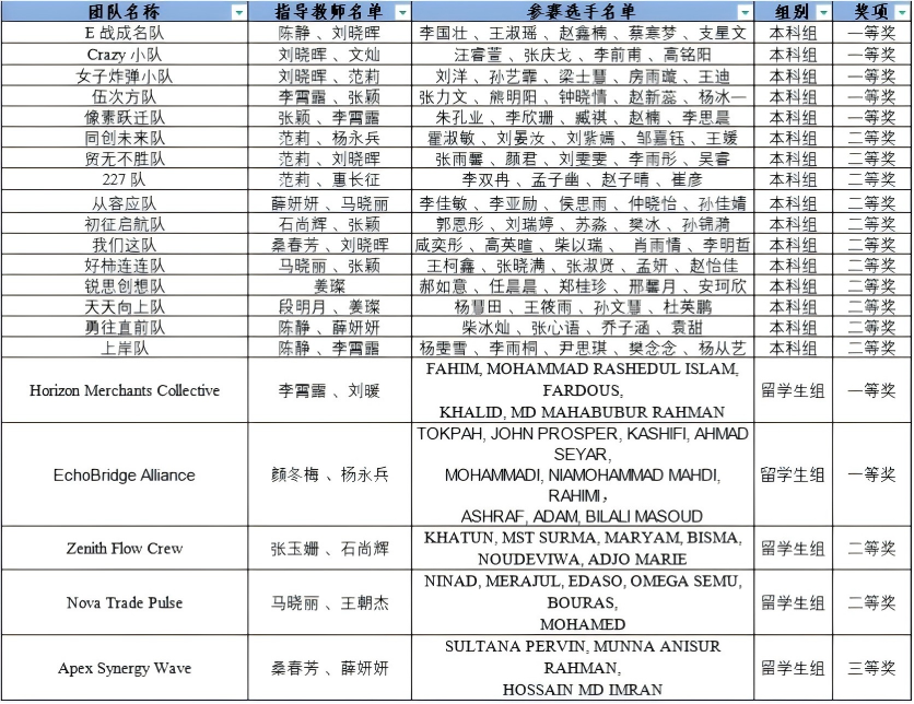 近日,2025年全国高校商业精英挑战赛国际贸易竞赛跨境电商赛道比赛圆满落幕。我校外国语学院在本次比赛中斩获佳绩,共获国奖21项。本科生组获国家一等奖5项、二等奖11项,留学生组获国家一等奖2项,二等奖2项,三等奖1项。其中,7支国家一等奖队伍入围全国精英赛。一等奖数量较往年实现大幅提升,获奖总数创学校参与该赛事以来历史新高,我校同时获最佳组织奖。
