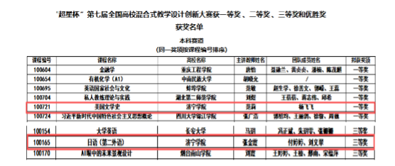 “超星杯”第七届全国高校混合式教学设计创新大赛吸引力来自全国500余所高校的数千名教师参加,外国语学院范莉老师团队的《美国文学史》课程(课程编号:100721)荣获全国一等奖,展现了其在混合式教学模式下的深厚学术功底与教学创新力。该课程融合线上线下资源,注重学生批判性思维与跨文化能力的培养,获得了评审专家的一致认可;外国语学院张金霞老师团队的《日语(第二外语)》课程(课程编号:100165)荣获全国三等奖,体现了其在语言教学与混合式教学设计方面的积极探索与扎实实践。