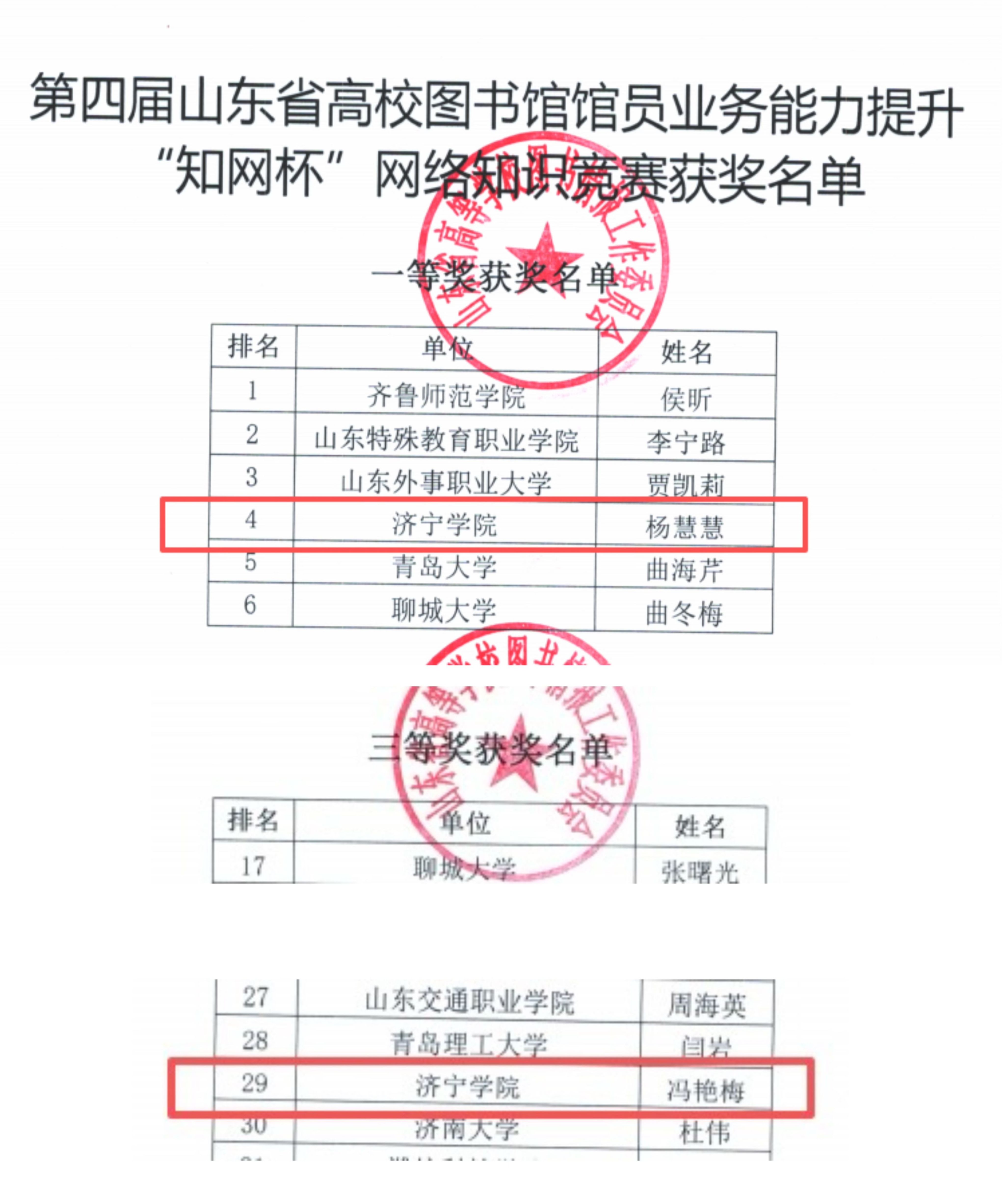 近日,山东省高校图书馆馆员业务能力提升“知网杯”网络知识竞赛获奖名单公布。我校图书馆杨慧慧荣获一等奖(全省排名第4),冯艳梅荣获三等奖(全省排名第29)。