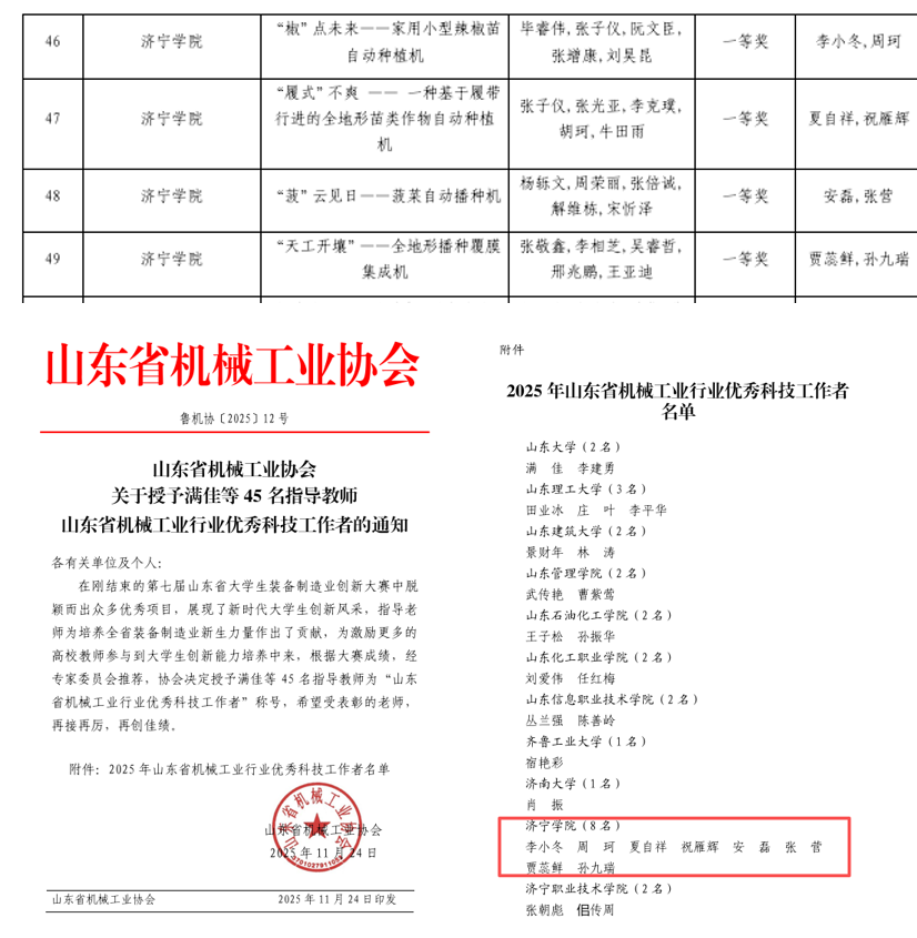 近日,第七届山东省大学生装备制造业创新大赛获奖名单公布,我校学子凭借扎实的专业素养与创新实践能力,在赛事中表现出色,荣获一等奖4项、二等奖2项、三等奖3项,我校8名指导教师荣获“山东省机械工业行业优秀科技工作者”称号,充分彰显了我校在机械装备制造领域应用创新人才培养的成效。