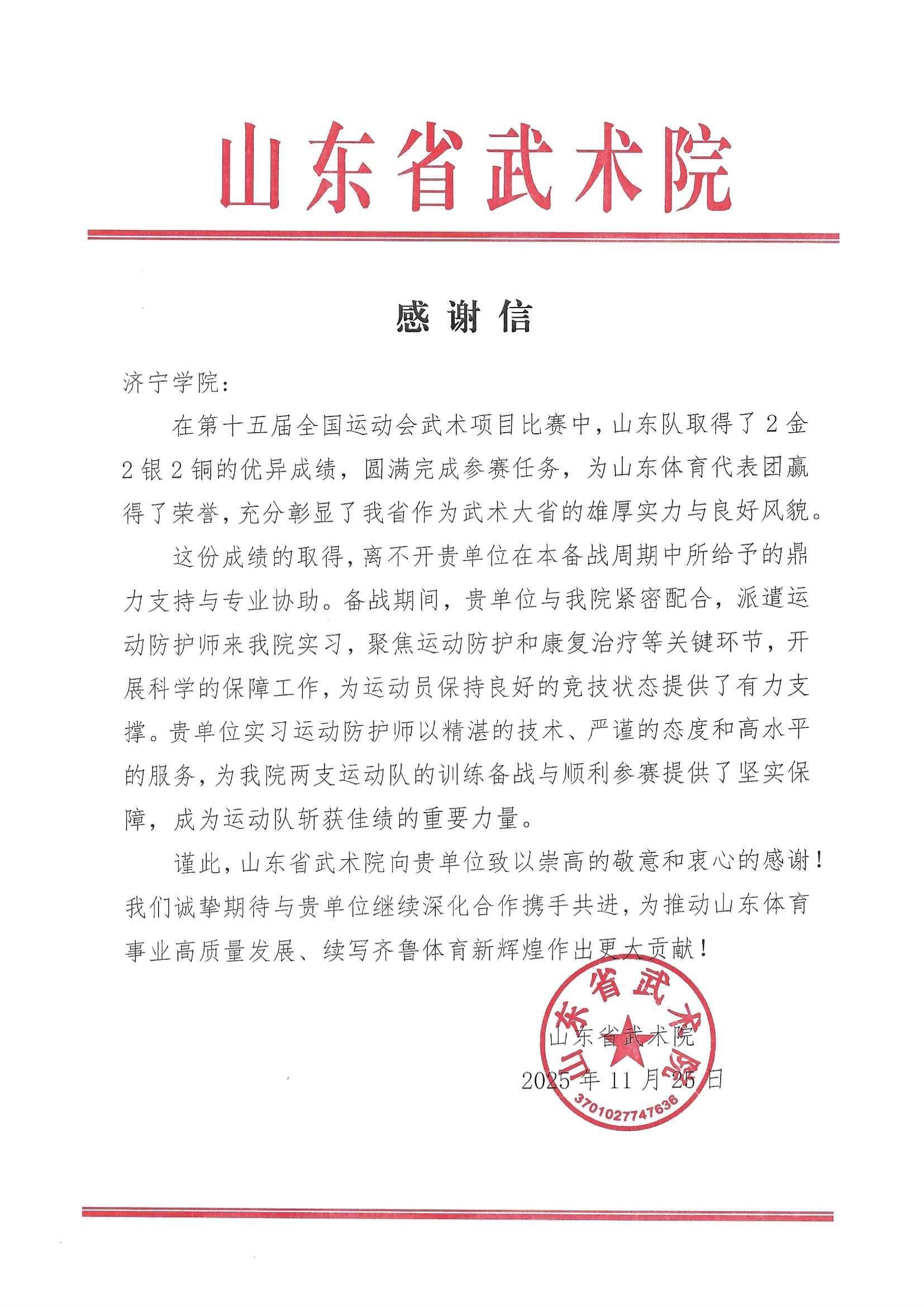 山东省武术院在赛后专门发来感谢信,对济宁学院给予的支持与协助致以崇高敬意和衷心感谢,并表达了深化合作、携手共进,共同推动山东体育事业高质量发展的诚挚意愿。