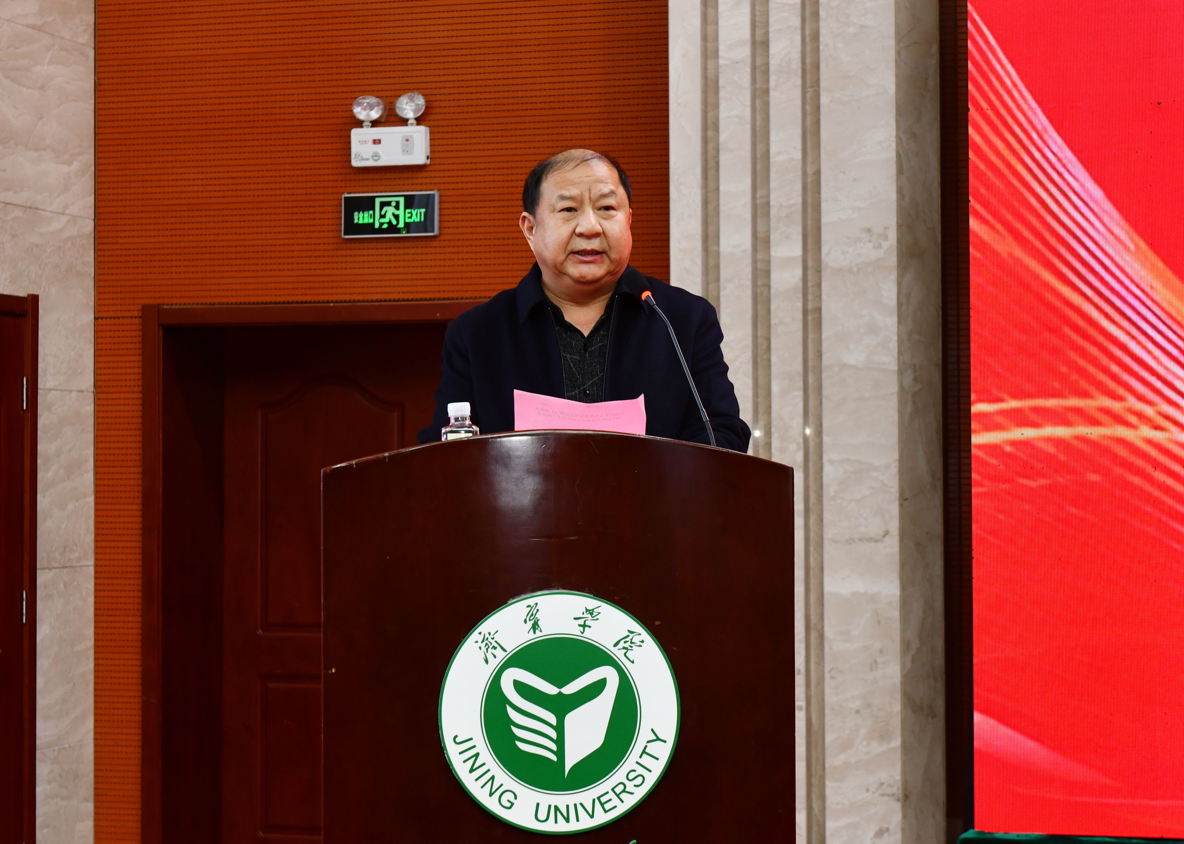 丰家雷致欢迎辞。他代表济宁学院党委行政和全校师生向参加活动的退役军人部门各级领导、专家和嘉宾表示热烈欢迎,对多年来关注和支持济宁学院发展的社会各界人士表示衷心感谢。他简要介绍了学校的办学历史、学科专业、师资队伍、人才培养以及退役军人培训情况。他指出,学校主动对接山东省退役军人事务厅和济宁市退役军人事务局承接退役军人培训项目,迄今为止已成功举办了六期培训班,助力退役军人顺利实现从部队到地方的角色转变。此次活动的举办,是学校深化退役军人培训工作、拓展服务领域的重要举措。他表示,学校将深化与政府、企业等社会各界的合作,共同探索退役军人培训新模式,为退役军人提供更加全面、专业的培训服务,与退役军人一路同行,以AI赋能,以教育圆梦,共同书写退役军人高质量就业创业的辉煌篇章,为巩固发展军政军民团结大好局面、推进中国式现代化建设贡献济宁学院的智慧和力量。