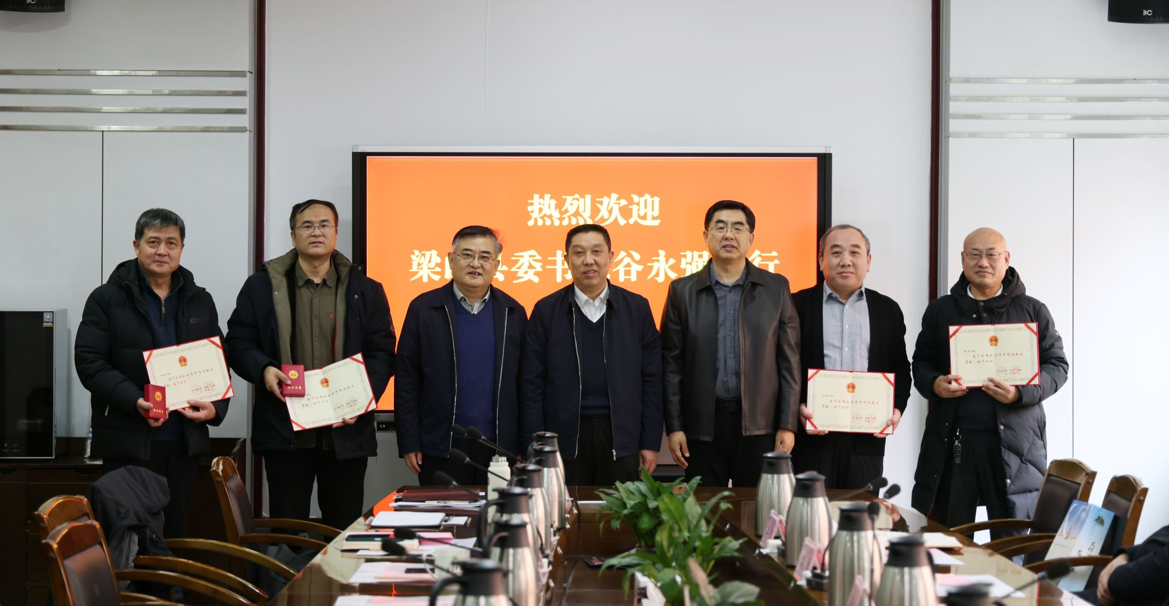 谷永强对学校四位派驻“第一书记”的工作表现及取得的成绩给予高度评价,对学校长期以来选派优秀第一书记倾力帮扶梁山发展致以衷心感谢。他表示,梁山县委、县政府将持续深化与济宁学院的校地合作,在乡村振兴、教育教学能力提升、产业发展技术革新等方面加强交流,提升县域教育服务水平、经济发展能力,切实推进教育振兴和产业振兴。会上,谷永强代表梁山县委、县政府向我校赠送感谢信,并为四位“第一书记”颁发记功荣誉证书,表彰他们作出的突出贡献。