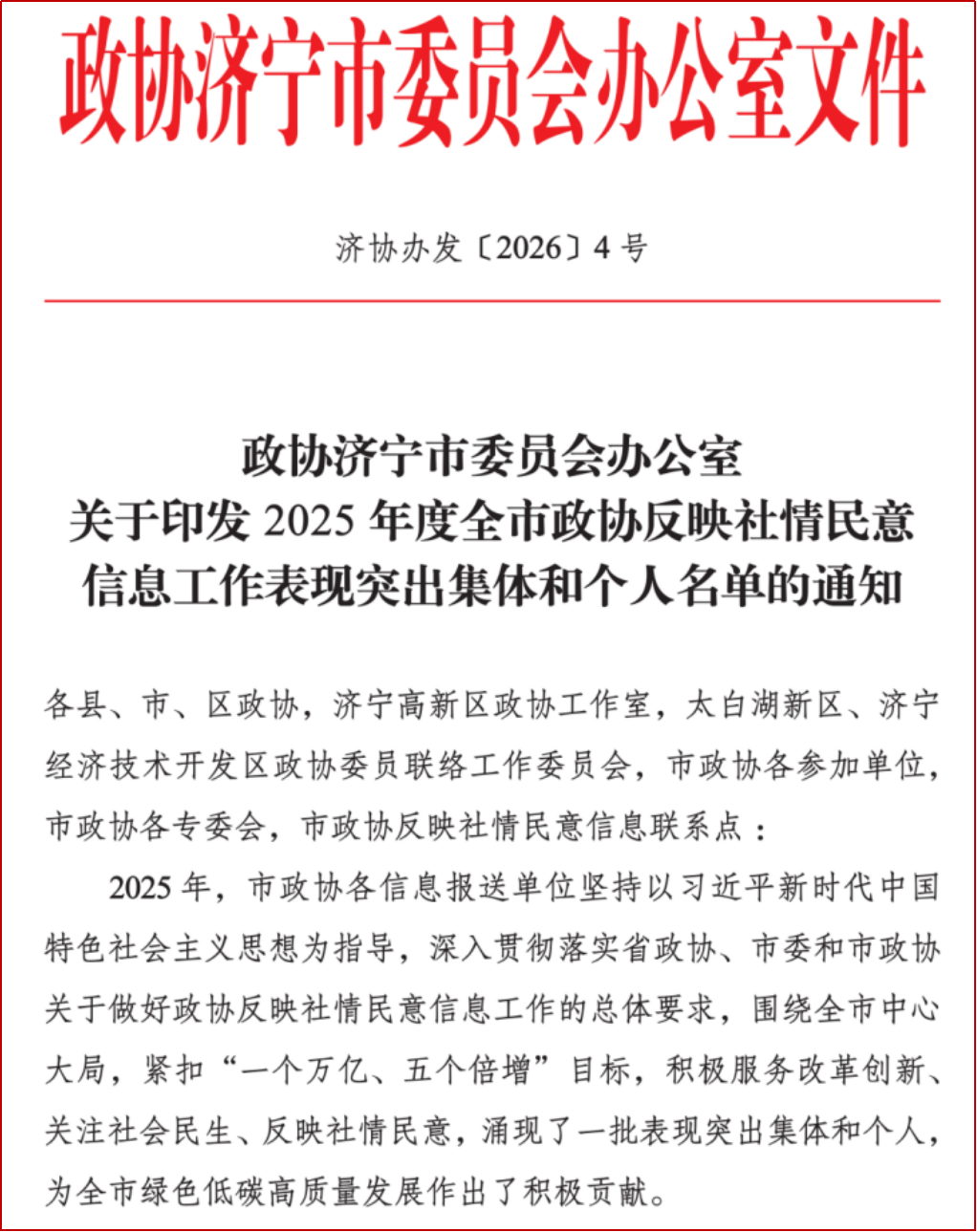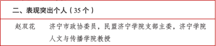 3月25日,政协济宁市委员会办公室发布《关于印发2025年度全市政协反映社情民意信息工作表现突出集体和个人名单的通知》。我校凭借在服务改革创新、关注社会民生方面的突出贡献,荣获“表现突出集体”,济宁市政协委员、民盟济宁学院支部主委、我校人文与传播学院教授赵双花荣获“表现突出个人”。