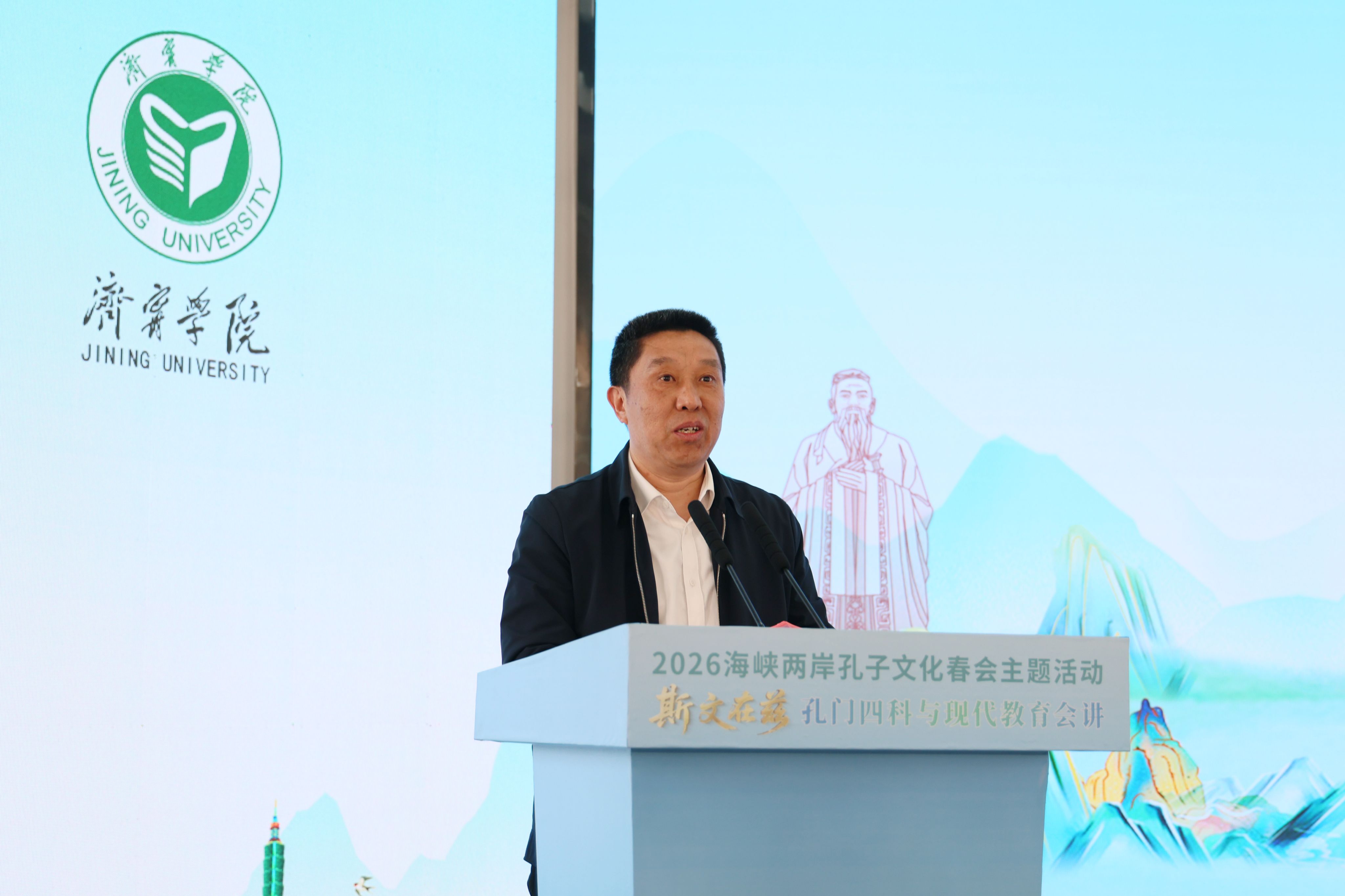仲红波致欢迎辞,对跨越海峡而来的台湾同胞及莅临学校的各位领导、嘉宾表示热烈欢迎,向长期致力于中华优秀传统文化传承发展的海峡两岸专家学者与各界友人致以崇高敬意。他指出,孔子教育思想是两岸同胞共同的精神财富,更是增进两岸认同的重要纽带。济宁学院根植孔孟之乡,办学历史可上溯至1905年衍圣公孔令贻创办的曲阜县官立四氏初级完全师范学堂。百年文脉赓续,见证了传统家学到现代教育的发展,承载着中华优秀传统文化的根脉和基因。他表示,济宁学院将以此次活动为契机,充分发挥孔孟之乡文脉底蕴深厚和文化资源集聚优势,全面落实立德树人根本任务,不断深化中华优秀传统文化研究阐释和普及,加强两岸文化交流合作,提升文化育人实效,为文化强国、教育强国建设贡献更多的智慧和力量。