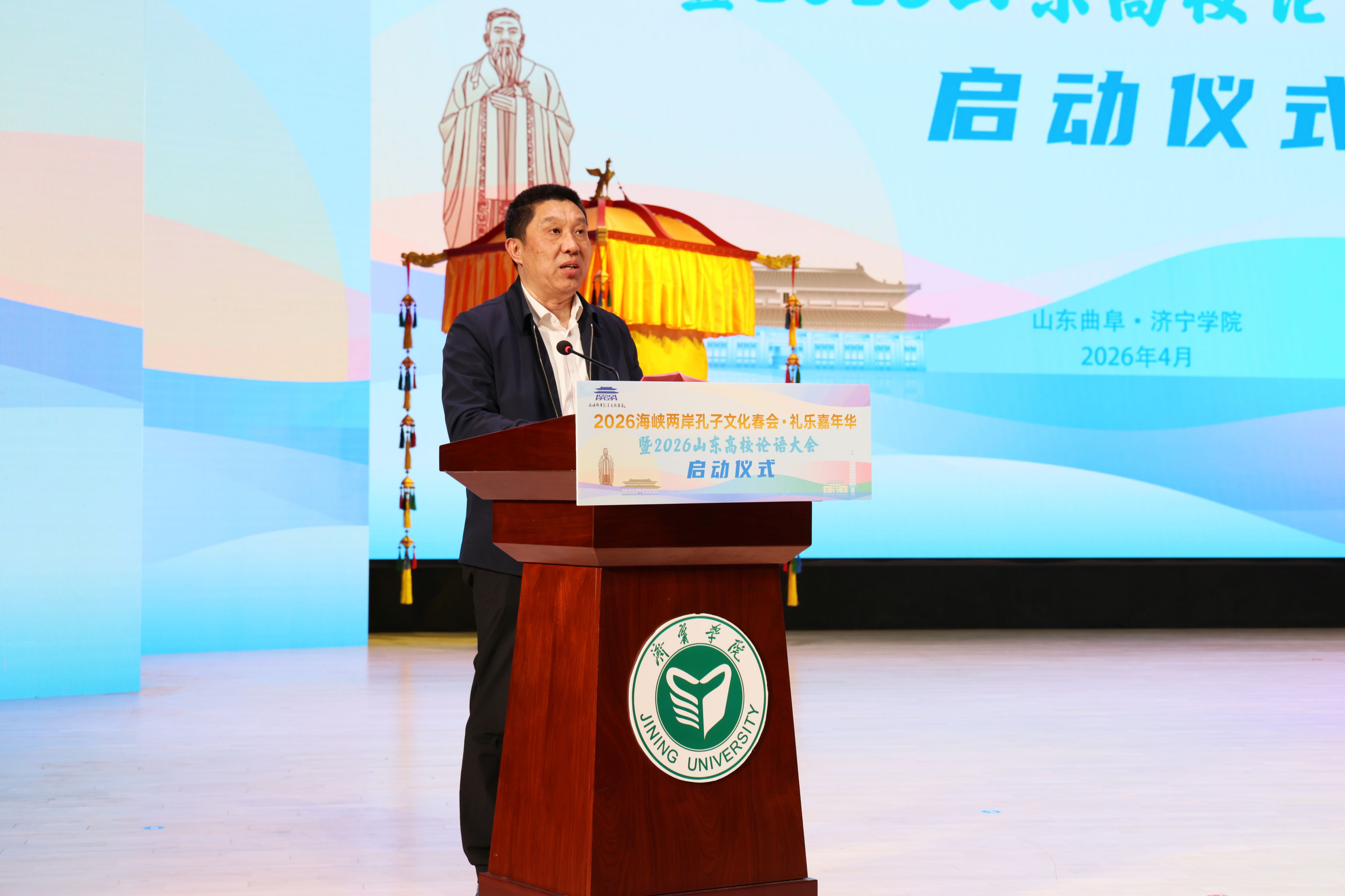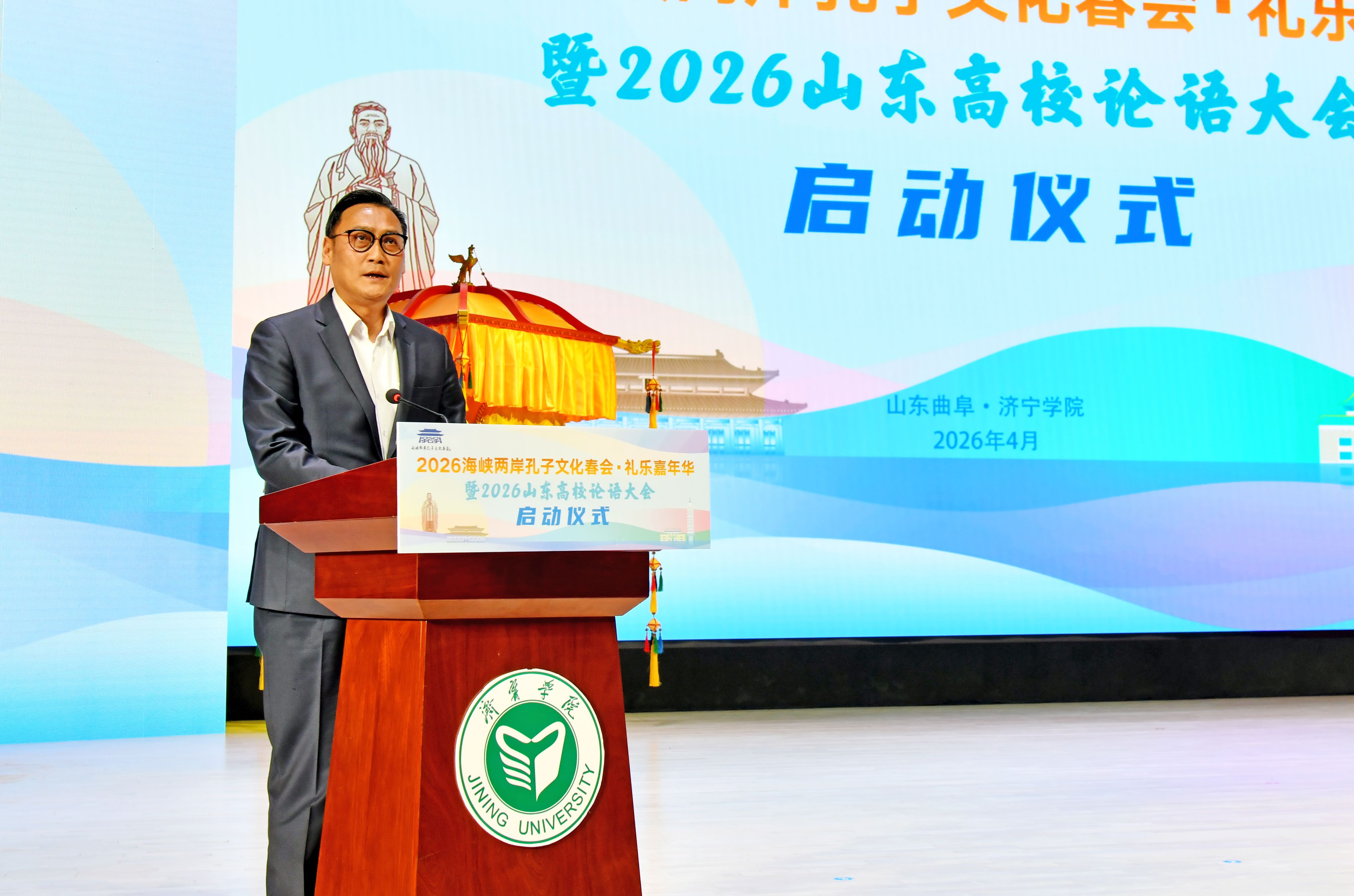 4月1日下午,2026海峡两岸孔子文化春会礼乐嘉年华暨2026山东高校论语大会启动仪式在济宁学院隆重举行。孔子第79代嫡长孙、至圣孔子基金会会长、济宁学院名誉校长孔垂长,至圣孔子基金会执行长陈泰旭,尼山世界儒学中心(中国孔子基金会秘书处)党委委员、副主任刘皓,北京师范大学中国公益研究院院长王振耀,台湾东吴大学教授李克明,台北市立大学教授张晓生,济宁学院党委书记仲红波,党委副书记、校长王清明,山东教育电视台党委委员、副台长陈本刚,曲阜文化建设示范区党工委副书记、推进办主任朱湘华,济宁广播电视台党组副书记、总编辑尚朋,济宁银行党委委员、副行长刘志刚,我校领导丰家雷、赵明、孔繁润、张永强、刘克非出席活动,学校各单位部门负责人、师生代表以及200余位台湾嘉宾应邀参与此次盛会。
