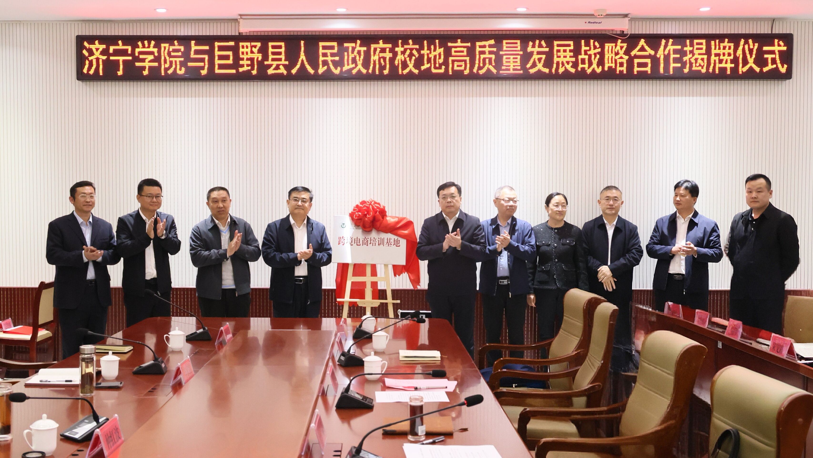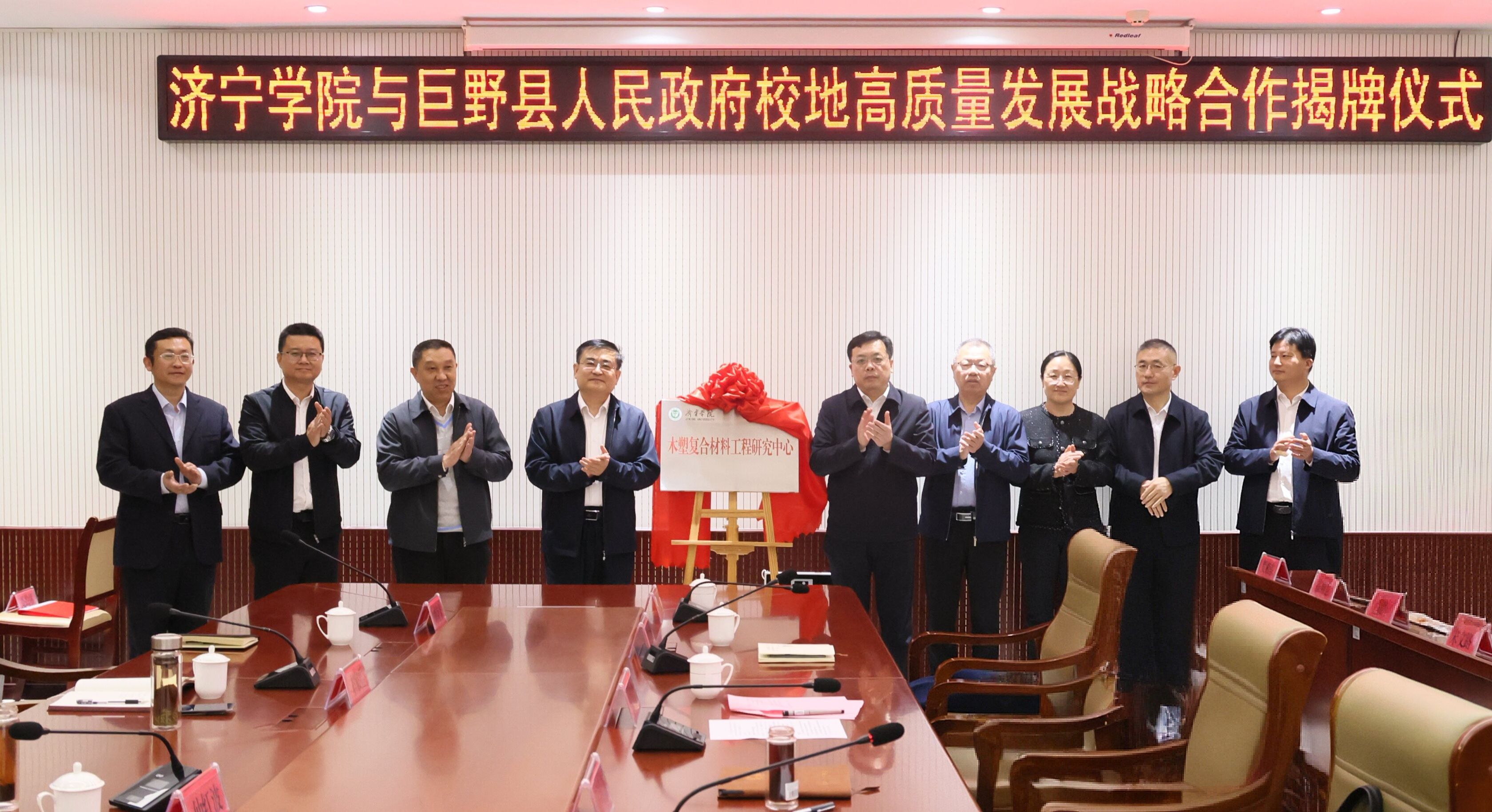 丰家雷与朱宪龙代表双方为思政培训科研基地、教师教育培训基地、跨境电商培训基地、木塑复合材料工程研究中心揭牌,双方领导共同见证。