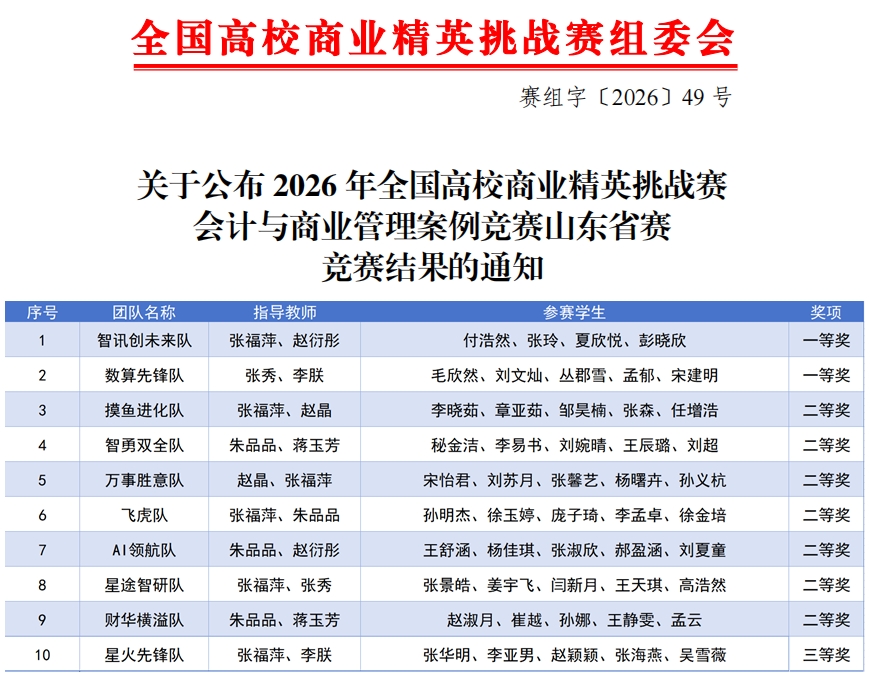 近日,由中国国际贸易促进委员会商业行业委员会、中国国际商会商业行业商会和中国商业经济学会共同主办的2026年全国高校商业精英挑战赛会计与商业管理案例竞赛山东省总决赛落下帷幕。我校经济管理学院共遴选10支代表队参赛,经过激烈角逐,斩获省级一等奖2项、二等奖7项、三等奖1项。