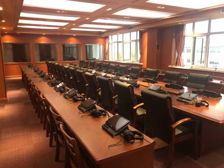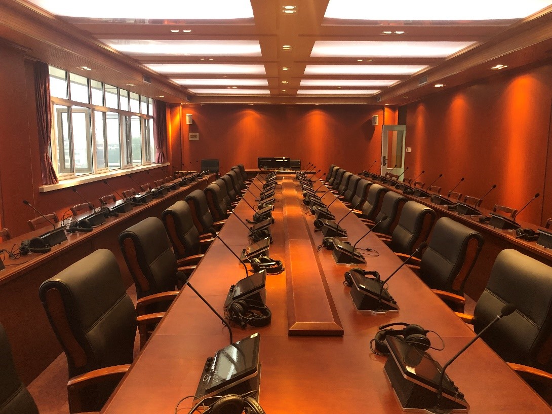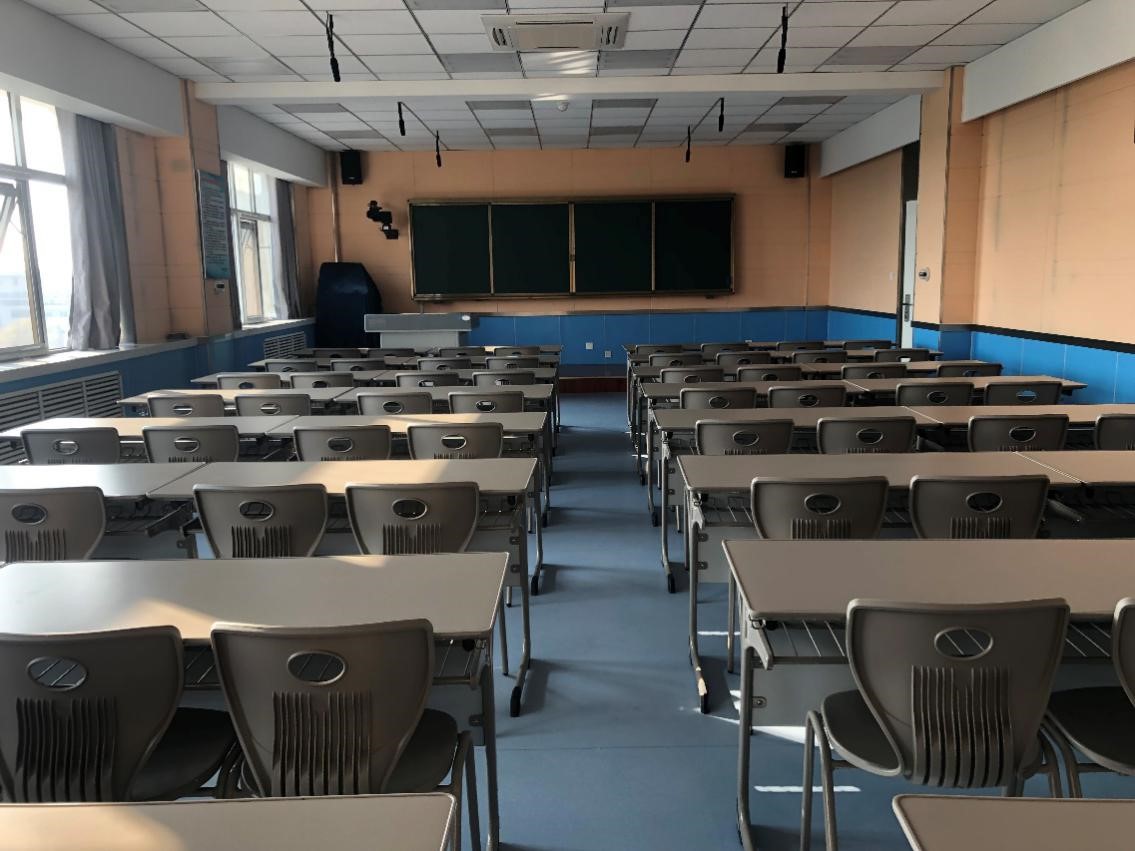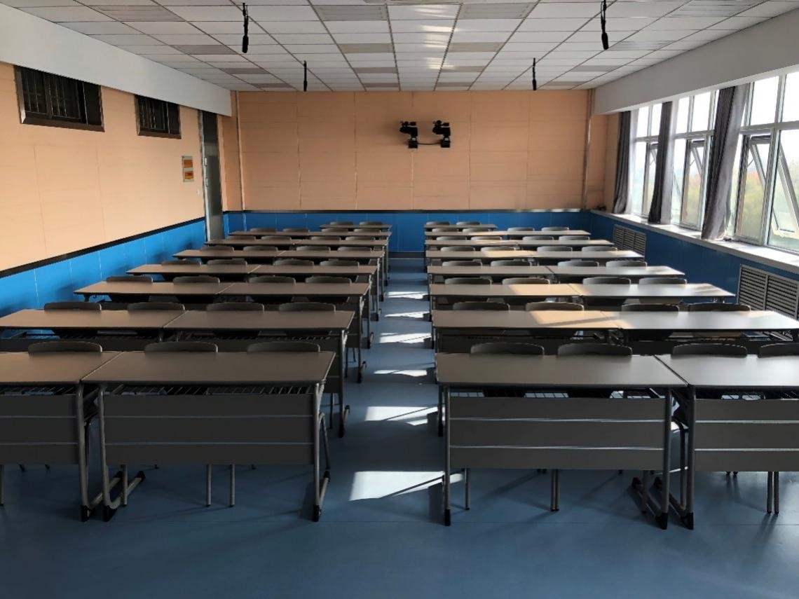 同声传译室位于教学楼3号楼A503,使用面积117平方米。实验室采用国内一流的同声传译会议、训练系统,配有4个同声传译译员间(8个译员席)、1个主控台(主席机)、50个代表席和一个发言席,所有代表席位根据需求可以一键切换成译员席,实现多个语种的同声传译,全部席位均配有高音质耳机以及麦克风、内置嵌入式720P高清摄像头,可以共享互联网资源,实现课程实时录播、远程教学、可视会议。