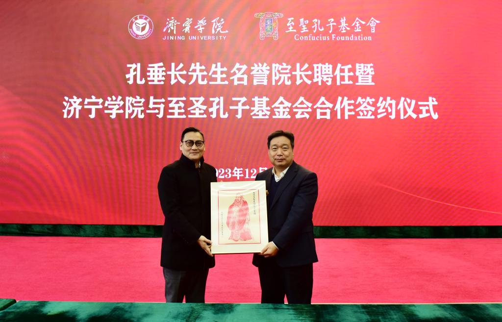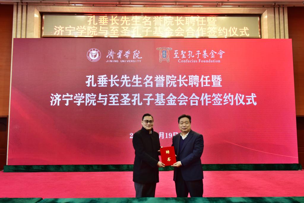 12月19日上午,孔垂长先生名誉院长聘任暨济宁学院与至圣孔子基金会合作签约仪式在我校科技楼报告厅隆重举行。济宁学院党委副书记、院长王清明,孔子第七十九代嫡长孙、至圣孔子基金会会长孔垂长出席仪式并致辞。至圣孔子基金会执行长陈泰旭、执行委员杨健、学术部主任张凝,济宁市政协副主席展鑫,曲阜市委常委、办公室主任、统战部部长、市政协党组副书记毛玉华出席仪式。校领导李凡路、赵明、孔繁润、刘国栋、刘克非,以及我校相关部门单位负责人和师生代表参加活动。仪式由济宁学院党委副书记丰家雷主持。