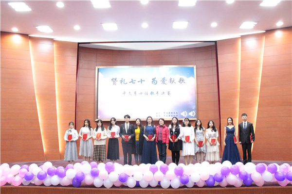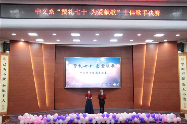 11月18日晚,由中文系团总支主办,百花音乐协会承办的中文系“赞礼七十,为爱献歌”十佳歌手大赛决赛在理科楼报告厅举行。中文系党总支副书记李青、辅导员张甜,团总支学生会代表、各社团代表及2019级全体同学参加了本次活动。
