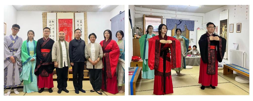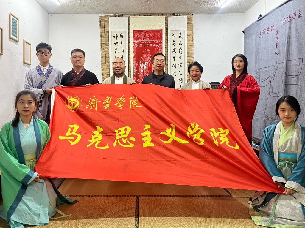 随后,曲阜孔子文化促进会秘书长孙邦君向师生教授了揖礼。揖礼是正式礼,为问候之礼,为敬重之礼,马院师生换上汉服,沉浸式体验了汉服文化,共拜先师孔子。