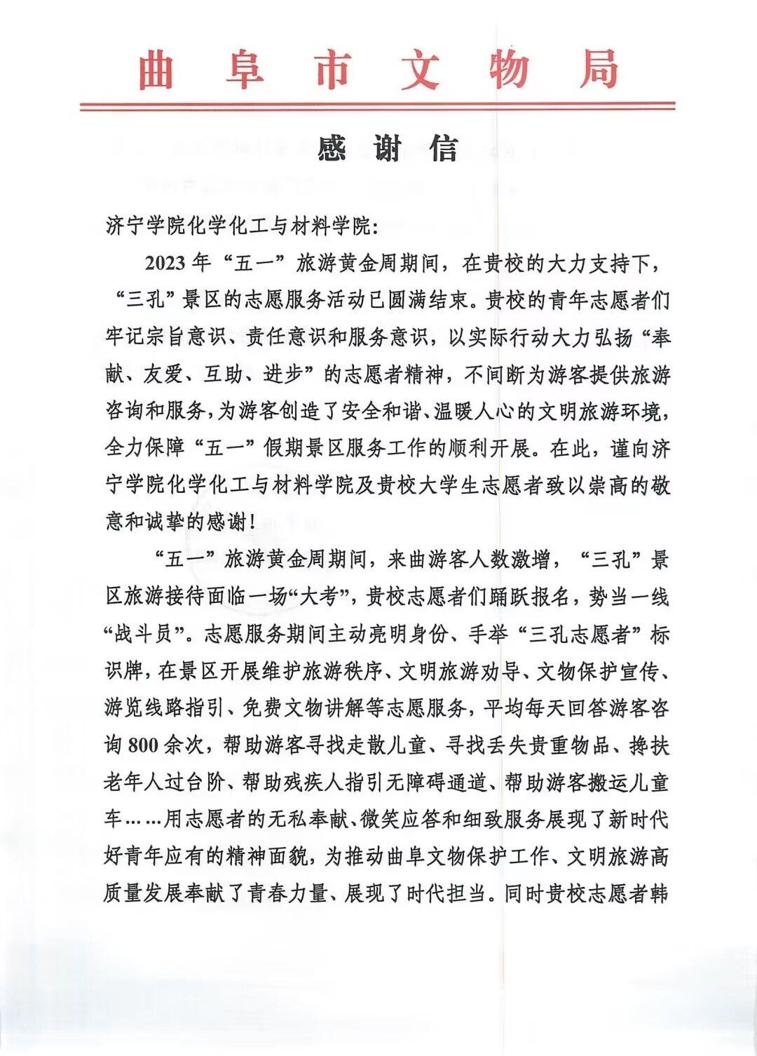 5月11日,曲阜文物局向化学化工与材料学院发来感谢信,对学院“儒小青”志愿服务团队在今年三孔景区“五·一“旅游黄金周期间的高质量志愿服务表达感谢。