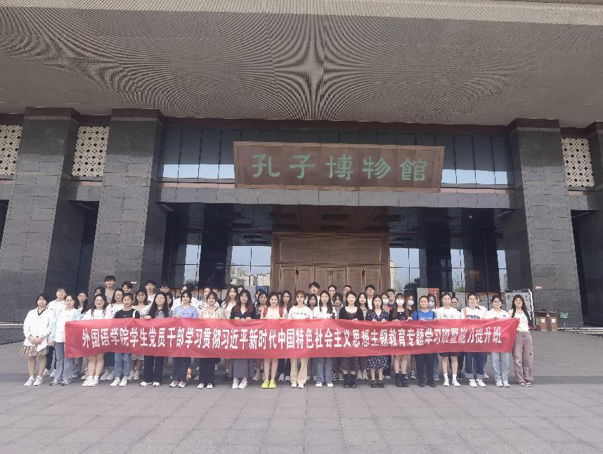 专题学习和能力提升班采取领导动员、个人自学、研讨交流、专题党课、实地研学、素质拓展、志愿服务等方式进行。期间,外国语学院党委副书记文灿带领学生党员干部前往孔子博物馆实地研学,在尼山镇鲁源新村新时代文明实践中心参观红色展厅,接受儒家文化和红色文化熏陶,进一步坚定文化自信,凝聚奋进动力。外国语学院党员志愿服务队参加庆六一儿童节微爱童行成长计划微心愿发放仪式,弘扬服务精神,传递向上向善能量。外国语学院辅导员张磊讲授题为《砥砺前行继往开来做新时代“四有”青年》的主题党课,带领大家重温峥嵘岁月,聆听红色故事,激励广大青年坚定理想信念,淬炼党性修养。外国语学院辅导员田清敏组织开展素质拓展,学生党员干部之间在活动和游戏中加强沟通交流,增强团队凝聚力和向心力。