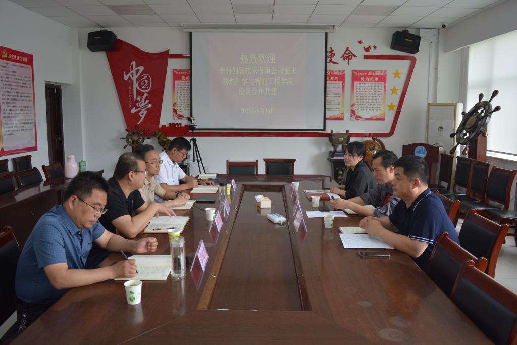 为推进产学研融合,深化校企合作,5月26日上午,山东华科创智技术有限公司整机厂厂长杨波、总监朱忠龙等一行应邀前来物理科学与智能工程学院座谈校企合作。物理科学与智能工程学院党委书记卫建勋、院长张营、党委副书记李洪波、副院长岳现房以及辅导员代表明强参加了座谈会,座谈会由卫建勋主持。