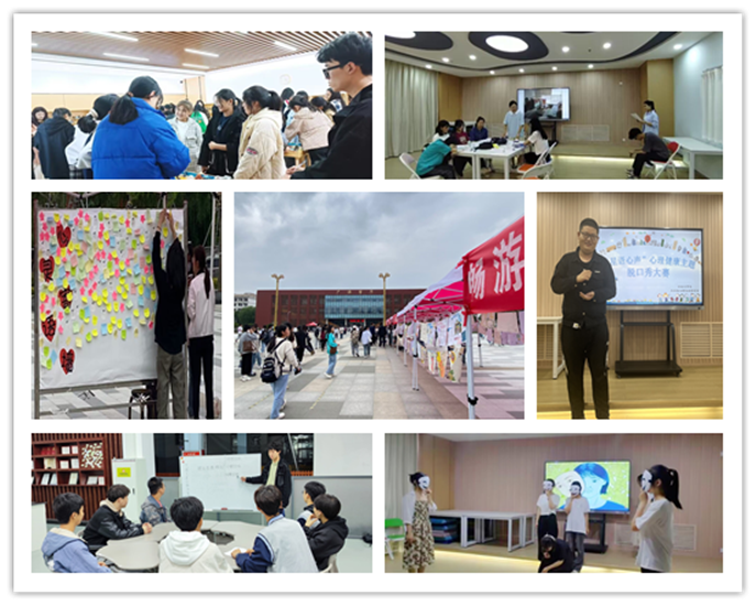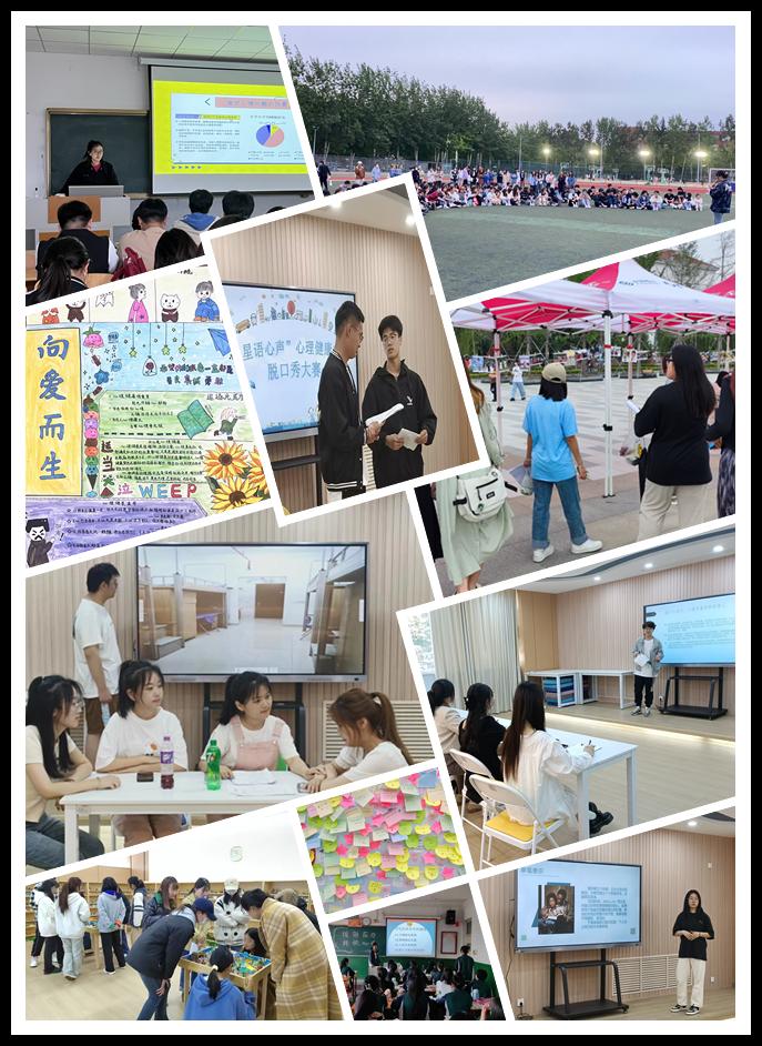 此次心理健康节主题突出,内容丰富,着力强化美育、体育和心育的有机结合,使学生在沉浸式活动中加强心理健康体验,大力培育学生珍视生命、热爱生活的心理品质。心理健康节期间,我校举办了形式多样、多姿多彩的心理健康教育活动,集知识性、趣味性、服务性为一体,动静结合、竞赛类活动和体验性活动融合。先后举办了如下活动:“有爱游沙见世界”宿舍团体沙盘游戏体验、“影如心像微光追行”心理影片赏析大赛、“解忧杂货铺爱回应心灵”心理健康主题手抄报比赛、“星语心声”心理健康主题脱口秀大赛、“心沐阳光笑绽颜开”微笑摄影展、第七届心理健康教育主题班会大赛、“心灵守护 相伴成长”心理健康知识竞赛、“阳光洒满心田 济园其乐融融”心理游园会和大学生心理健康教育中心体验活动。同时,各学院根据本学院学生和学科特点,举办了丰富多彩、特色突出的心理健康教育活动。例如,学前教育学院“倚笔画心 漫绘青春”心理四格漫画设计大赛、工程学院匠心领航,筑梦成长——沉浸式大学生就业心理调适、生命科学与生物工程学院“二十凝意气,共创‘心’蓝图”绿色环保新生态创意大赛、音乐学院音随心动,从“心”启航——心理健康音乐会和儒商学院“与心灵相约,与健康同行” 第一届Running在济园等。