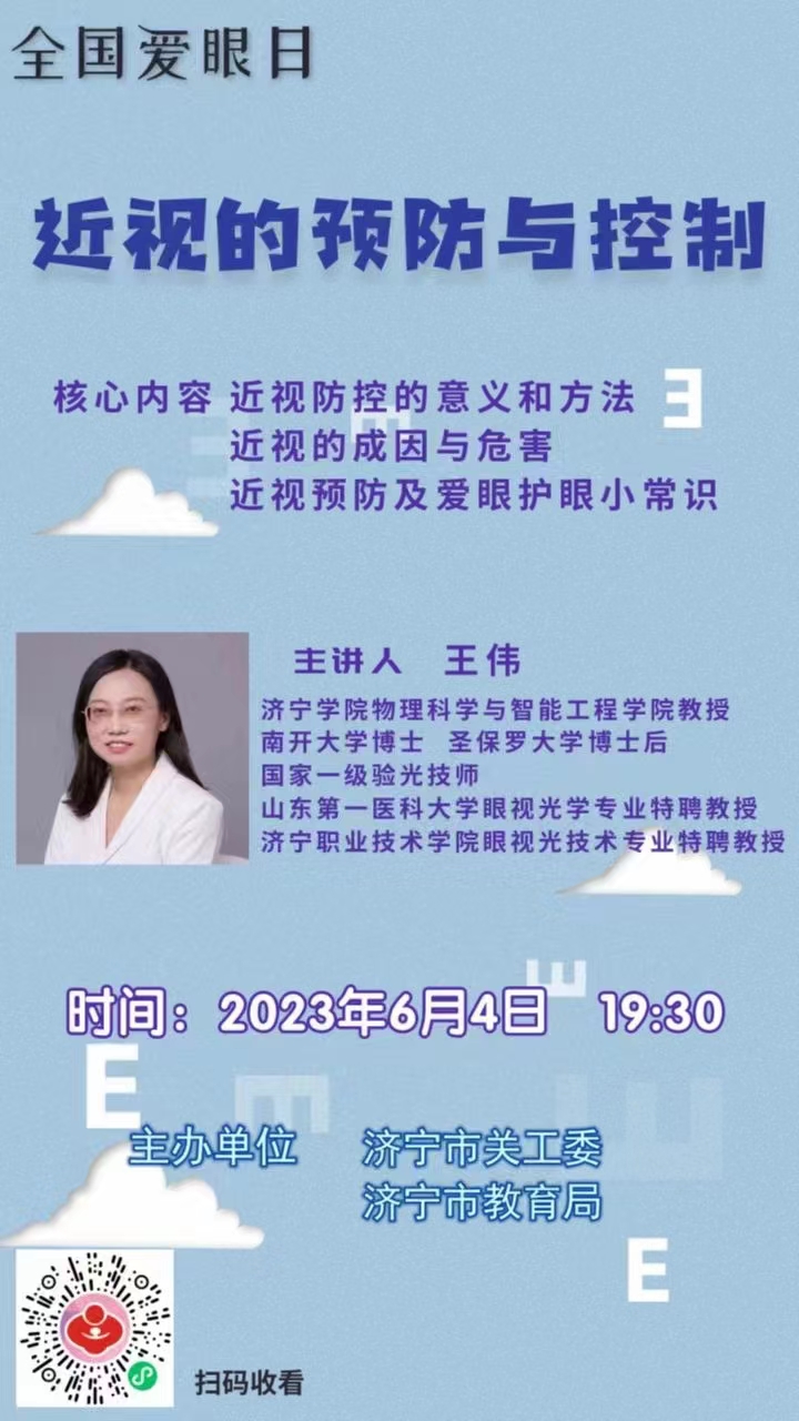 6月4日,在第28个全国“爱眼日”到来之际,为切实增强全市广大儿童青少年的爱眼护眼意识,营造近视防控宣传教育浓厚氛围,应济宁市关工委邀请,我院王伟教授开展“近视的预防与控制”公益网络直播讲座。
