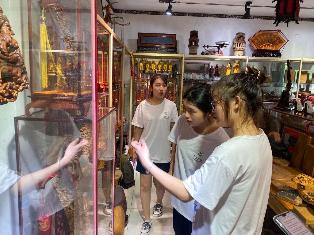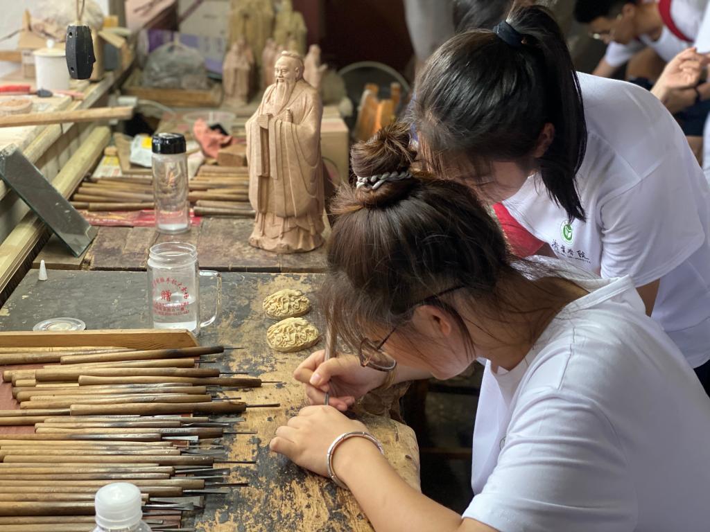 在孔林,社会实践队成员近距离观察楷雕的载体“楷树”,观看子贡手植楷,了解非遗文化项目“楷雕”背后所蕴含的丰厚的文化底蕴和道德内涵。队员们向孔子墓敬献花篮,表达对孔子的尊敬和传承中华优秀传统文化的决心。在孔子博物馆,队员们深入了解了儒家文化的发展和内涵,深刻体会到了儒家文化的博大精深。实践队伍访问楷雕非遗传承人宋爱民,深入了解楷雕的技法特点、艺术内涵、文化传承、发展现状。在曲阜工艺美术厂,队员们采访了非遗传承人颜景新的孙女颜世芹,了解老一辈楷雕艺术家用毕生光阴守护传统技艺的感人事迹。最后,志愿服务队走进小雪街道明礼社区,为50余名小朋友和家长上了一堂别开生面的楷雕文化课,并倡导大家身体力行,保护和传承优秀的传统文化。