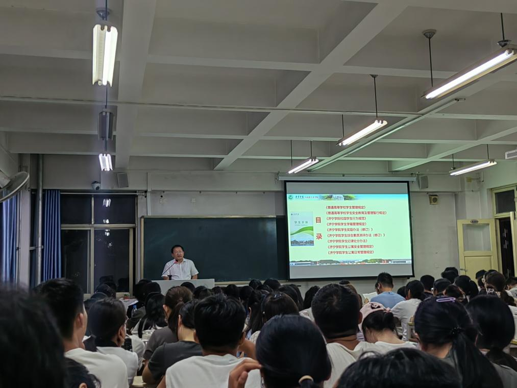 为帮助新生尽快了解校规校纪及学生教育管理的各项规章制度,教育新生自觉遵纪守法,遵守学校各项规章制度,9月12日,姚海生组织新生学习了《济宁学院学生手册》中省、学校关于学生管理、安全教育、公寓安全、行为规范、奖励办法等文件,促进新生将外在的约束内化为自觉的行为。