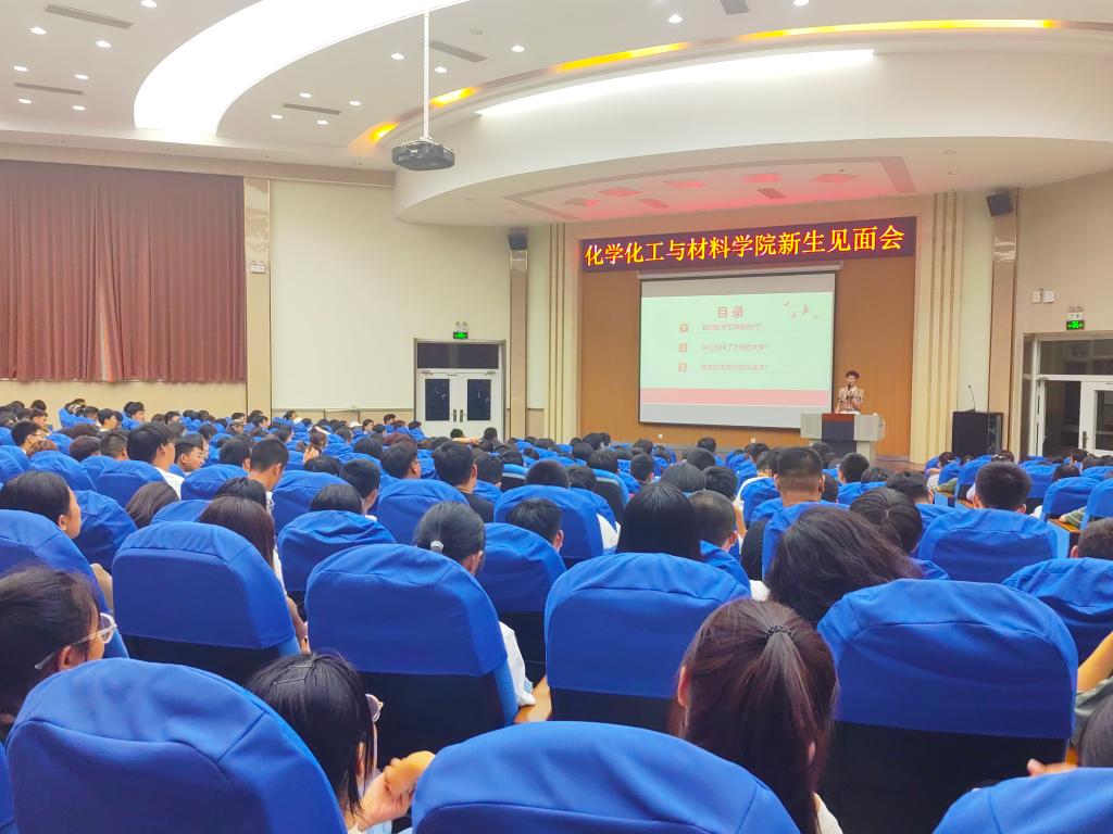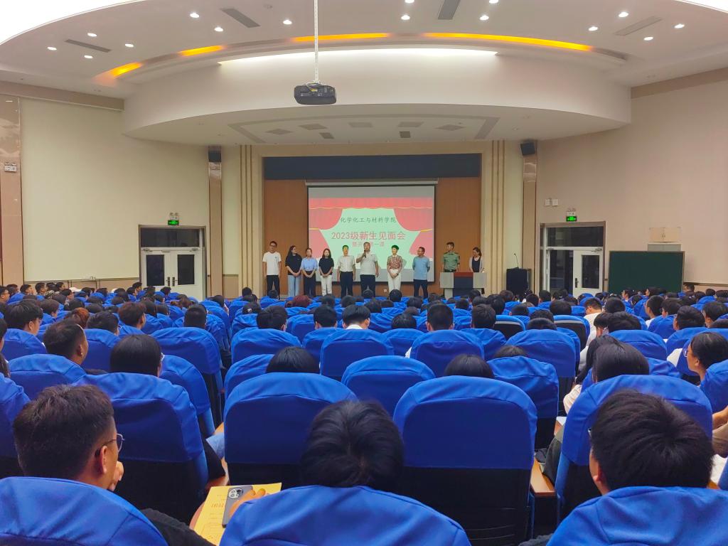 9月15日晚,化学化工与材料学院在3号楼报告厅举行2023级新生见面会暨开学第一课。院党委书记马新蕾、院长刘涛、党委副书记王明锋、化学化工实验中心主任张海峰和学院全体辅导员出席见面会。见面会由学院团委书记李文婷主持。