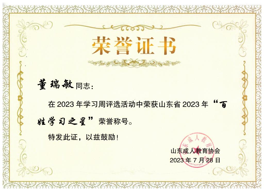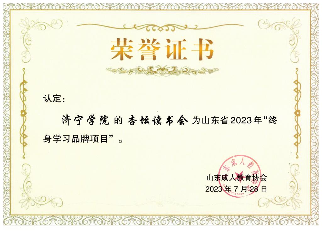 在2023年山东省全民终身学习活动周中,我校图书馆“杏坛读书会”被认定为“终身学习品牌项目”,董瑞敏荣获“百姓学习之星”荣誉称号。