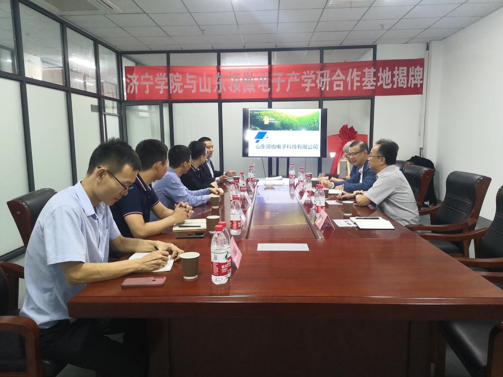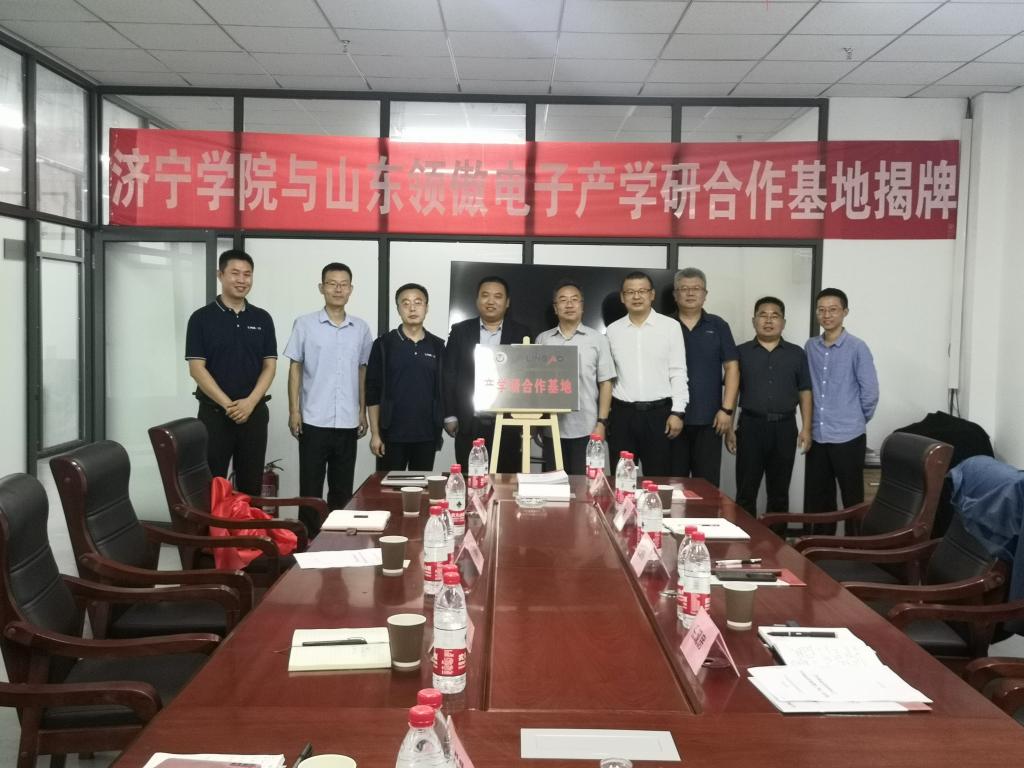 会后,在山东领傲电子科技有限公司会议室,卫建勋与刘国平共同为“济宁学院-山东领傲电子科技有限公司产学研合作基地”揭牌。