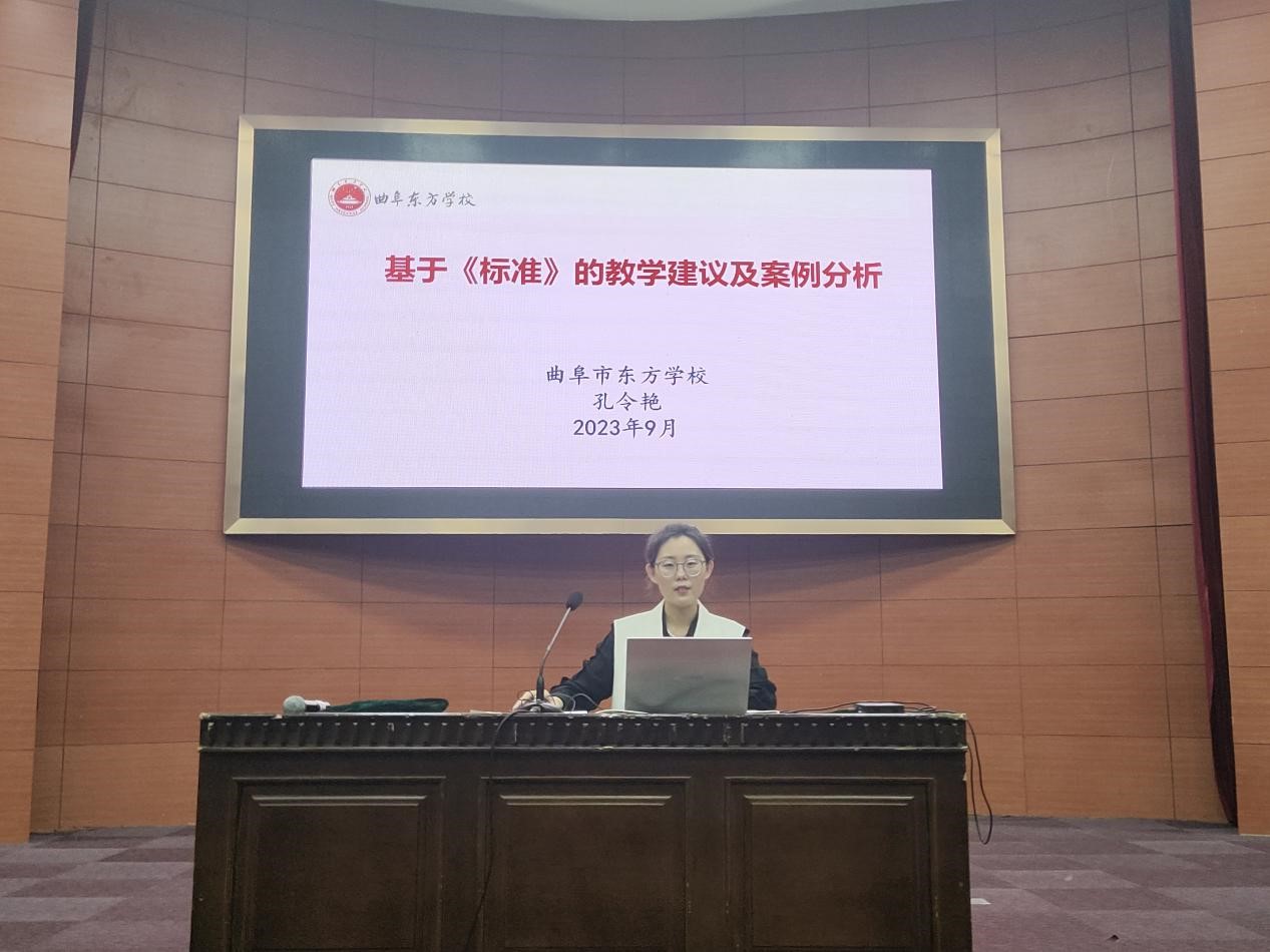 9月27日晚,外国语学院在理科楼报告厅开展“名师·名校长进校园” 暨师范生从业技能培养工作坊第十七期活动,本次活动由外国语学院和教务处联合主办,邀请曲阜市东方学校副校长孔令艳作了题为“基于《标准》的教学建议及案例分析”的报告。报告会由外国语学院副院长张颖主持,部分教师代表和英语师范专业大二至大四300余名学生参加了此次活动。