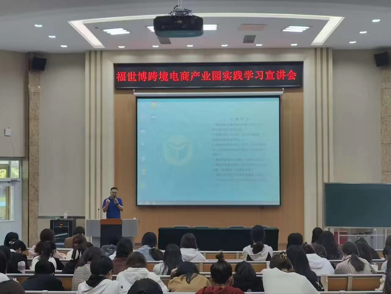 宣讲会分为四个部分,福世博公司负责人王总率先给同学们介绍了公司前期的运营情况和往年销售实绩,并分别就跨境电子商务、国际贸易及供应链管理等方面进行了深入浅出的讲解。他结合实际案例,生动形象地介绍了跨境电商的运营模式、平台特点及物流解决方案等。张总则是对同学们的住宿、饮食等生活情况做了讲述。李霄露主任讲解了此次实践学习的方案及学分安排等。最后,同学们就自己关心的问题进行了提问,相关负责人做了详细解答。整个宣讲会气氛热烈,同学们反响积极,大家纷纷表示十分期待接下来的实践学习。