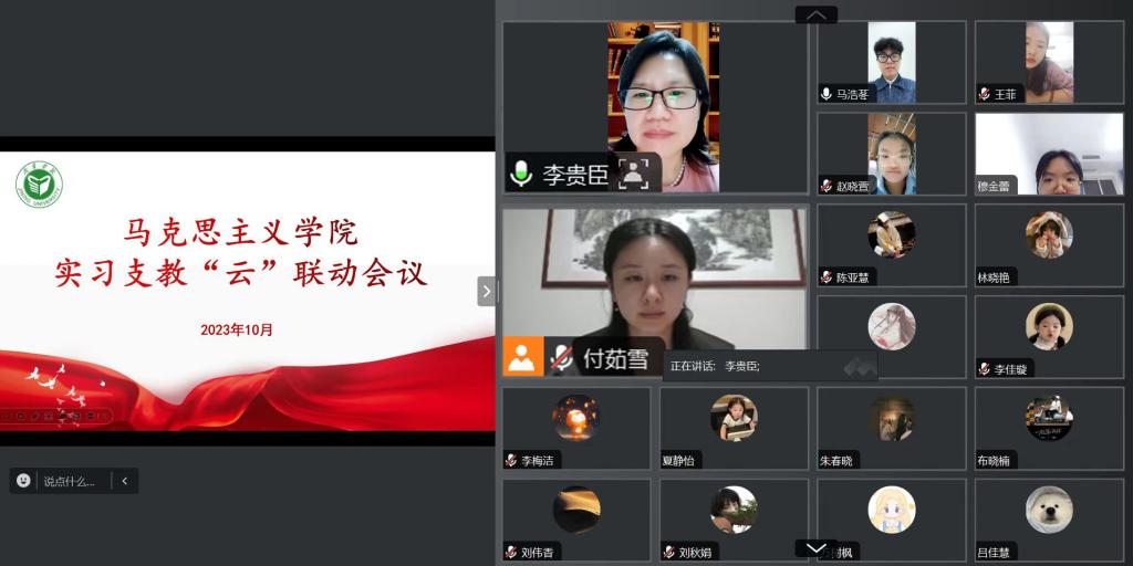 为保障实习支教工作的顺利开展,帮助实习支教学生更好地应对教学挑战,马克思主义学院召开2023年秋季师范生实习支教“云”联动会议。支教学生辅导员、指导教师参加会议。