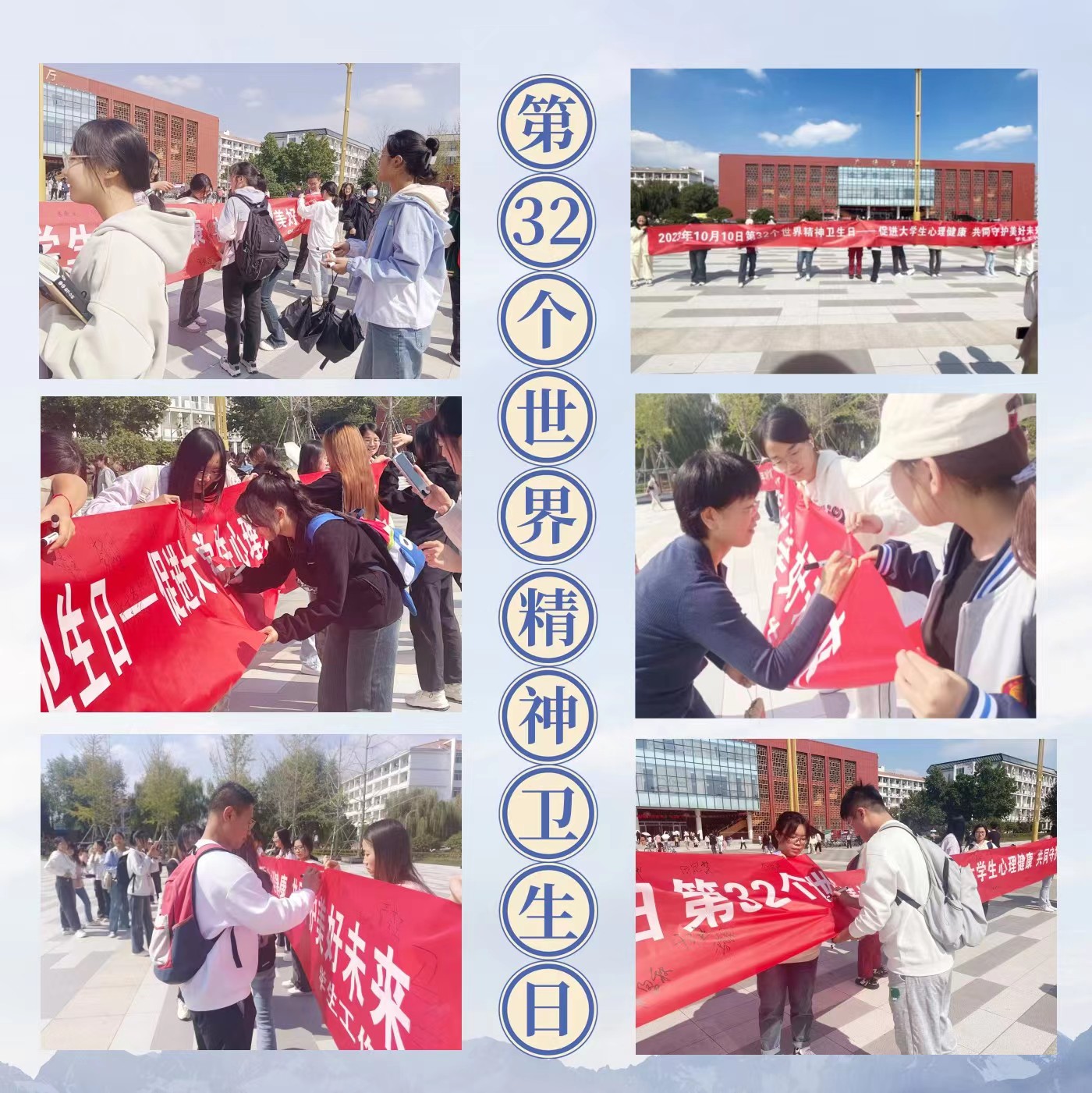 10月10日是第32个世界精神卫生日。为进一步加大心理健康教育宣传力度,提高全校师生对心理健康的重视程度,10月10日,学生工作处在餐厅广场举办以“促进大学生心理健康 共同守护美好未来”为主题的大型签名活动。