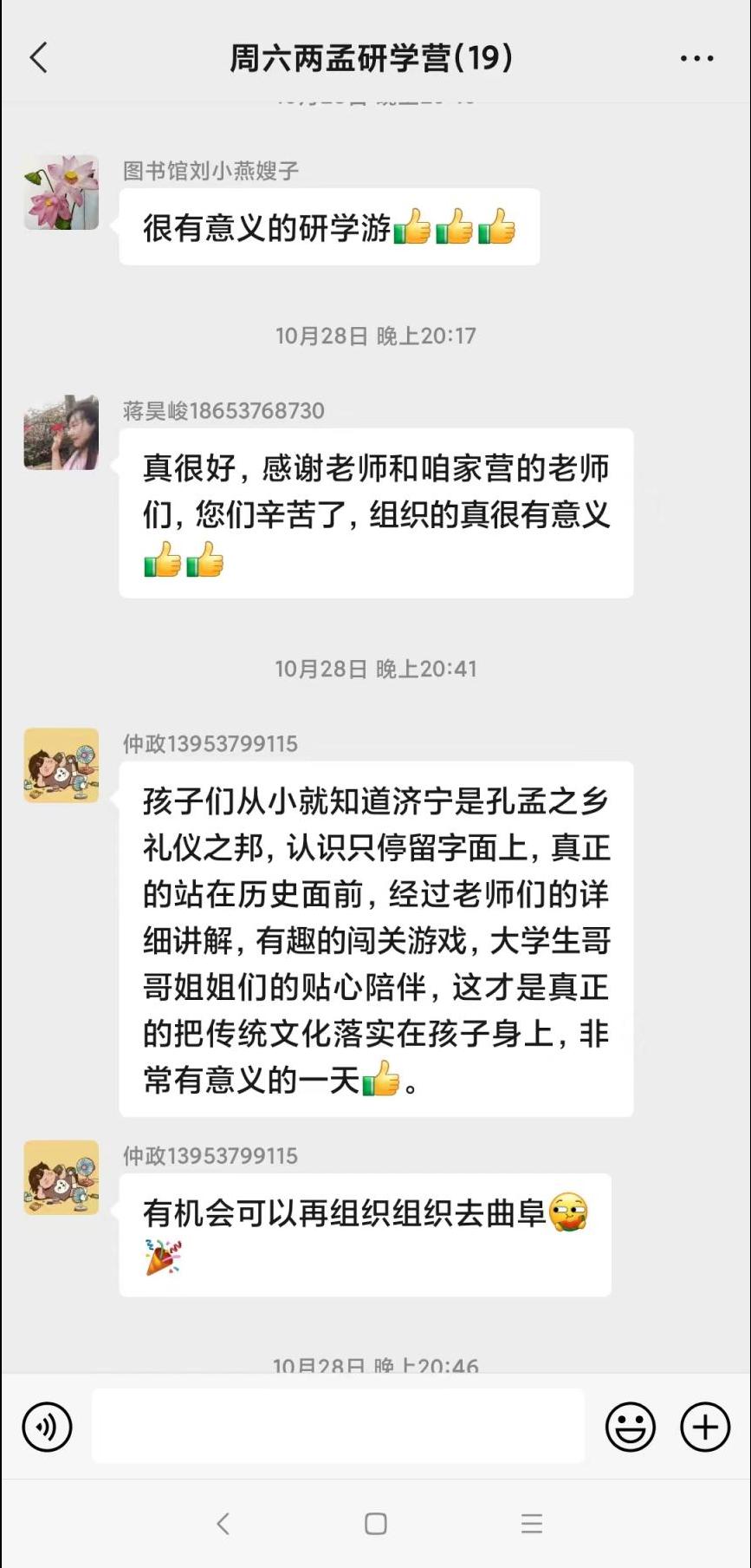 本次活动得到了社会的一致好评,也是我校服务地方的一次创新性实践,不仅让济宁中小学生切实的感受两孟文化及两孟文化中蕴含的科学智慧,使他们在儒风雅韵中收获成长,更是为我校大学生提供了宝贵的社会实践机会,为济宁学院研学游项目的下一步开展积累了经验。