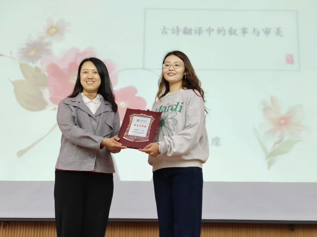 11月9日下午,外国语学院校友、青岛大学外语学院硕士生导师石灿做客校友大讲堂,作了题为“古诗翻译中的叙事与审美”的报告。外国语学院副院长张颖,党委副书记文灿,辅导员田清敏、段明月和2023级全体新生参加了此次活动,报告会由办公室主任闫彩霞主持。