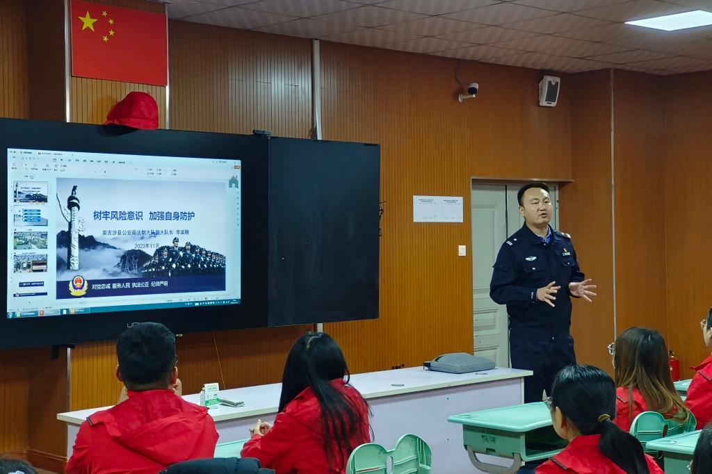 11月15日,英吉沙县公安局法制大队副大队长李英刚应邀做《树牢风险意识 加强自身防护》报告。报告会由郑宁主持,支教团全体成员参加。