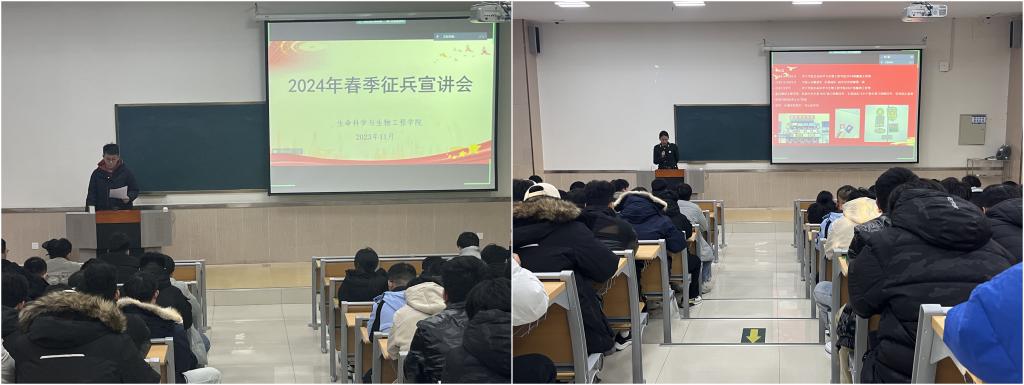 为加强大学生征兵入伍政策宣传,鼓励和引导大学生积极应征入伍,11月16日,生命科学与生物工程学院在9号楼D202教室举办2024年春季征兵宣讲会。该院退役大学生代表李坤、宋怡晨,2024届毕业班男生和其他年级学生代表参加本次宣讲会。