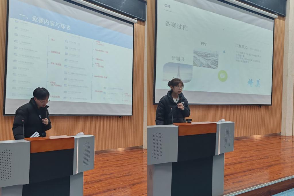学生代表王日成、曾宪洋分别以自身为例,对“互联网+”创新创业大赛和全国大学生化工设计竞赛的参赛流程及参赛经验进行了分享,向大家提供了参加竞赛和参与科研的建议,强调一定要坚持自己的初心,保持责任感,不断努力,提升自我。两位同学的分享让大家对创新创业和学科竞赛产生了浓厚的兴趣,激发了同学们的参赛热情。