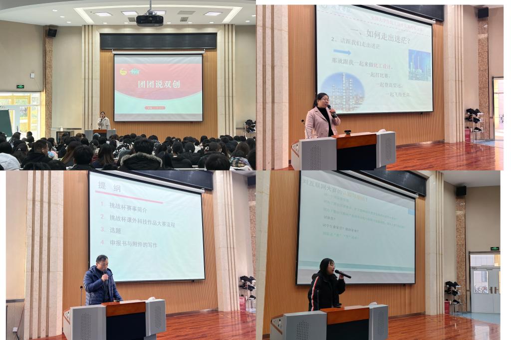 李文婷为同学们解读了创业就业普惠政策,以及大学生创新创业和学科竞赛相关知识,带领大家学习了《化学化工与材料学院创新创业与学科竞赛指引目录》和济宁学院大学生创新创业类教育全年系列活动安排,并展示学院2023年大学生创新创业和学科竞赛成果,让同学们对创新创业政策和各类竞赛有了更深入的了解。李继森从“挑战杯”竞赛简介、挑战杯课外科技作品大赛流程、选题、申报书与附件的写作几个方面对同学们做了详细指导,并提出大学期间要积极参与科学研究和论文发表的建议,对同学们日后的就业、升学具有很大帮助。张春仙老师从大学目标定位、全国大学生化工设计竞赛介绍、备赛收获等方面入手,鼓励同学们积极参加科学研究和学科竞赛,在竞赛中提升创新意识和创新能力,并给同学们播放了历届获奖学生寄语视频,同学们积极响应,纷纷加入交流群。杨慧芝为同学们分享了“互联网+”大学生创新创业大赛的开展时间、模式和要求,讲解了参与竞赛的重要意义和所需条件,勉励同学们积极参加创新创业竞赛,为学业深造、未来职业发展打下坚实基础。