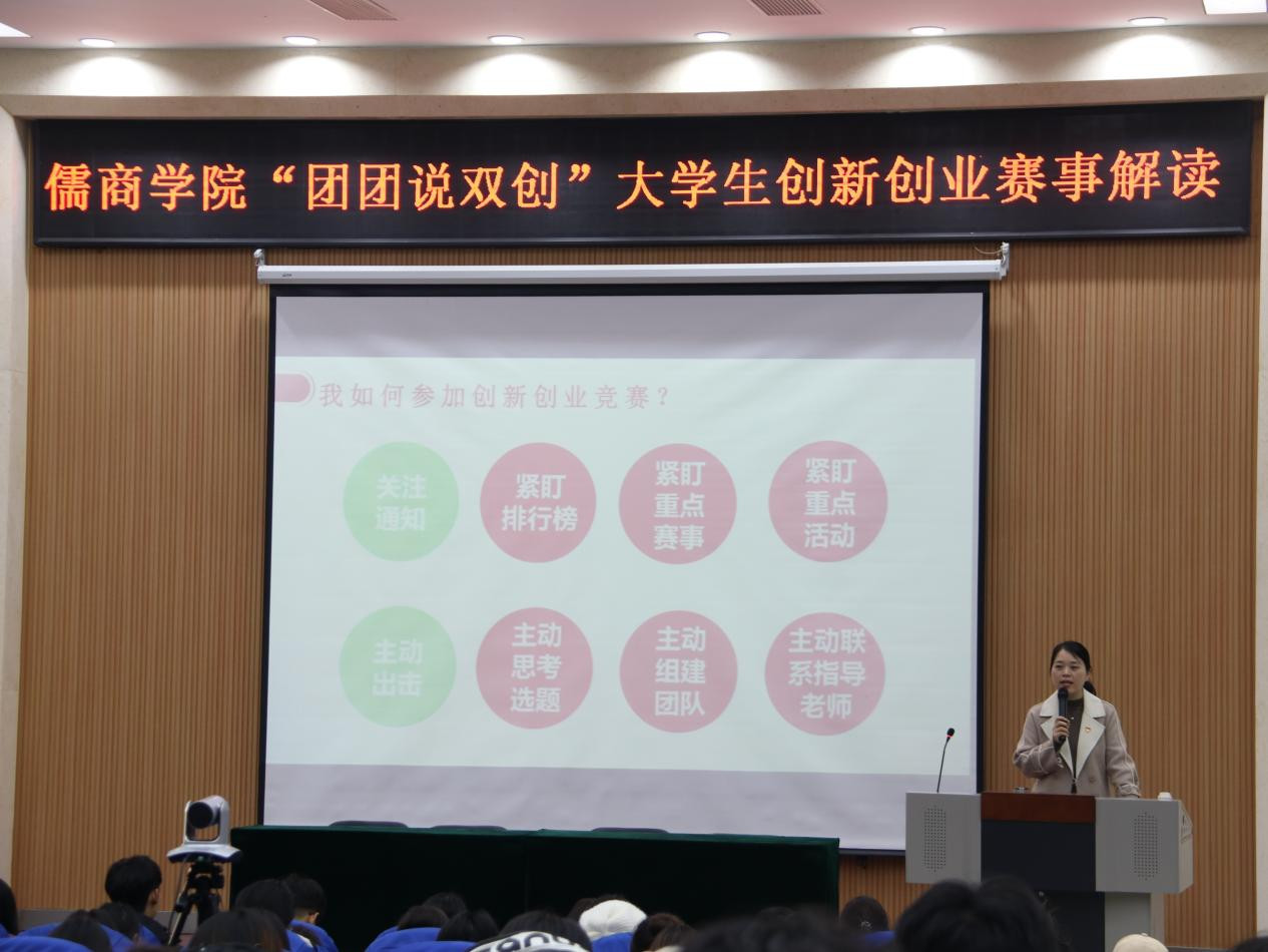 举办一次“团团说双创”活动。11月23日,儒商学院“团团说双创”活动。在3号楼报告厅开讲,并同步在8个分会场直播。该院团委书记袁芬以“大学生创新创业赛事解读”为题,为1600余名学生授课,详细解读了学校创新创业政策及经管类双创赛事基本情况,通过优秀双创团队参赛经历分析了各类赛事的核心要素与实战经验,并从确定项目选题,提早培育项目,坚持循环迭代,精心打磨项目等方面提出建设性意见,充分调动了师生参加大学生创新创业赛事的积极性和热情。