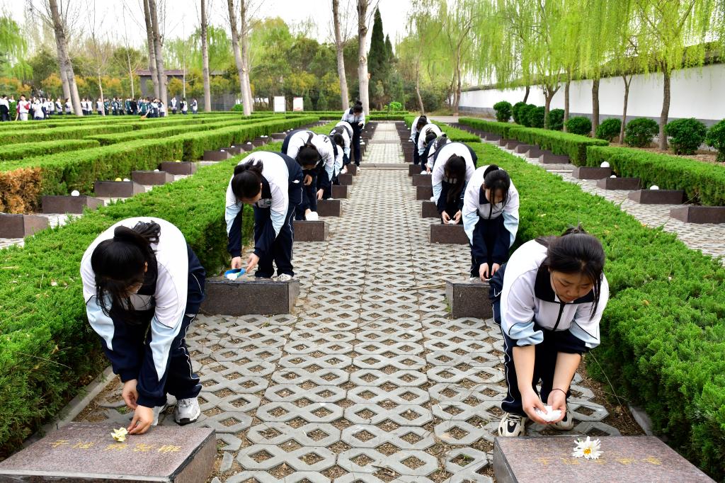 随后,身着整齐校服的同学们,怀着崇敬的心情,手捧自制的白花,整齐地排列在烈士墓前献花、清扫。