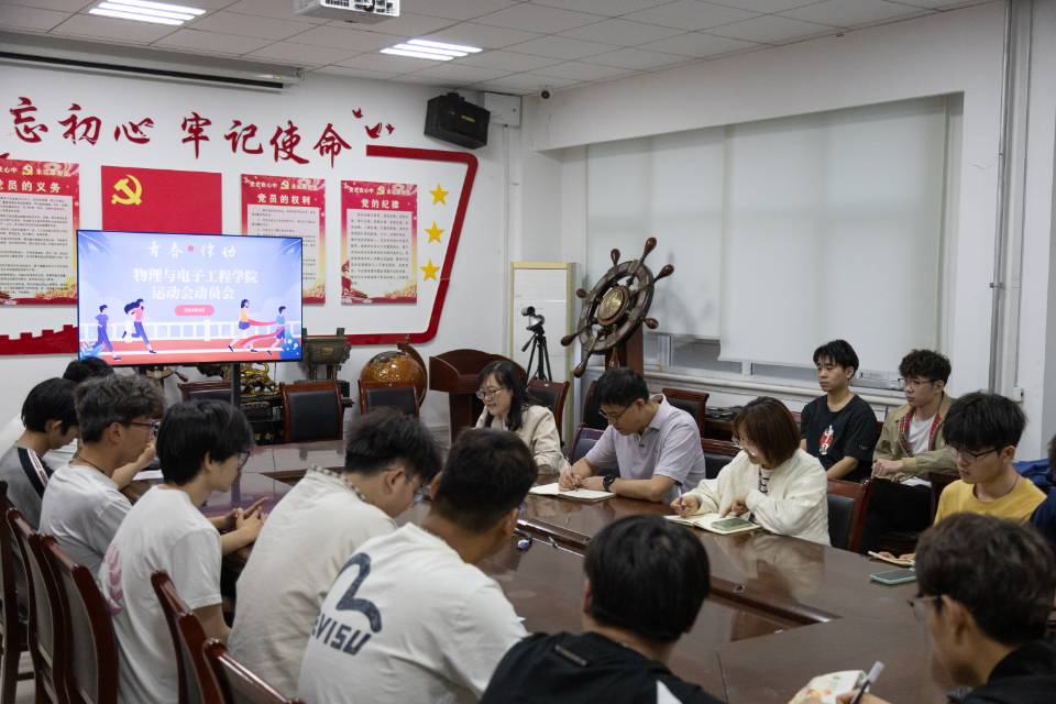 为充分调动学生积极性,保障春季运动会顺利进行,4月19日下午,物理与电子工程学院在理科楼二楼党员活动室召开运动会动员会,学院党委副书记李洪波、全体辅导员老师以及主要学生干部、运动员、方队成员等参加会议。