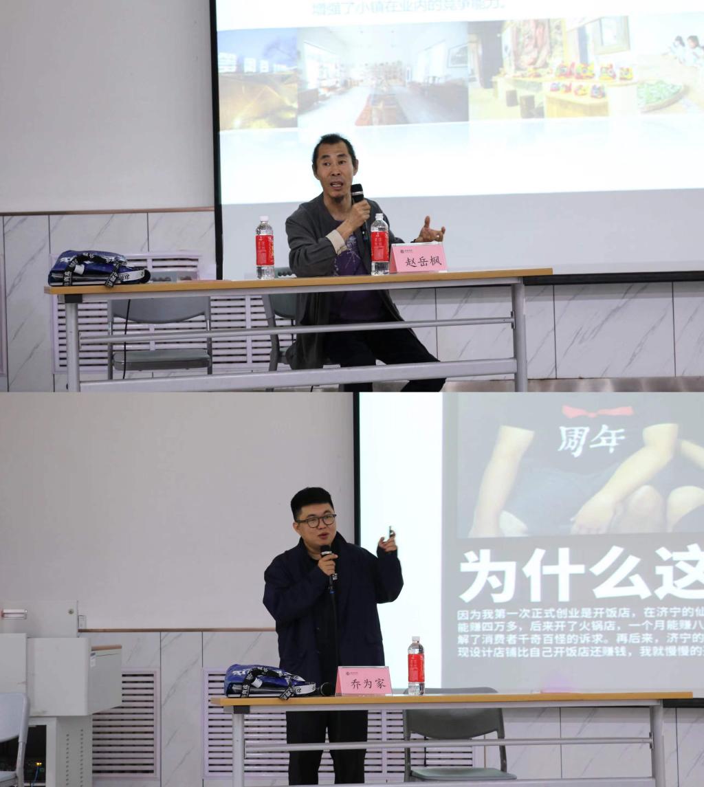 乔为家重点围绕“好看、好吃、好玩、好用”的设计研发理念,研判市场需求,带动关联产业,将一个个普通的项目转化为具有吸引力和市场竞争力的品牌产品。并以济宁仙营北里夜市(济宁首个夜经济示范项目)、济宁谷box超级夜市(山东首个集装箱夜市)、济宁运河记忆历史文化街区(山东省级示范步行街)、兖州东关未央街区等承担过的项目为例,回顾了创业途中遇到的困难与挑战,畅谈对就业创业工作的感悟与体会,与同学们一同谈收获、话成长、提建议,为即将毕业的学生们上了一堂精彩的就业创业指导课。