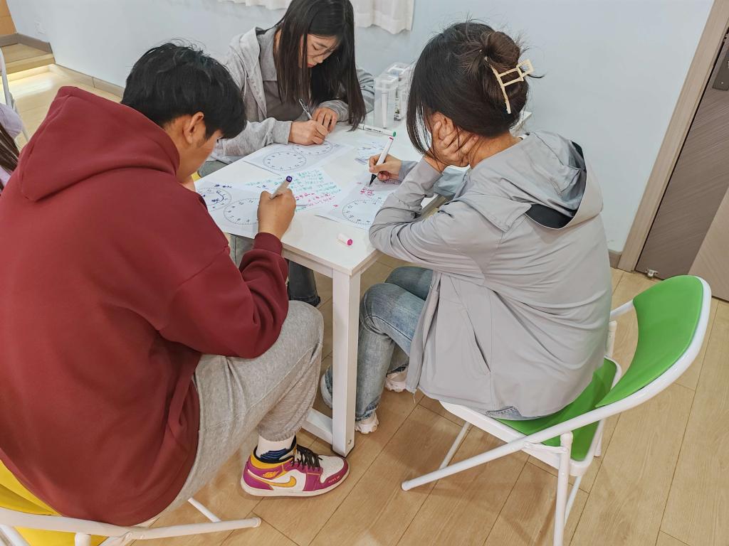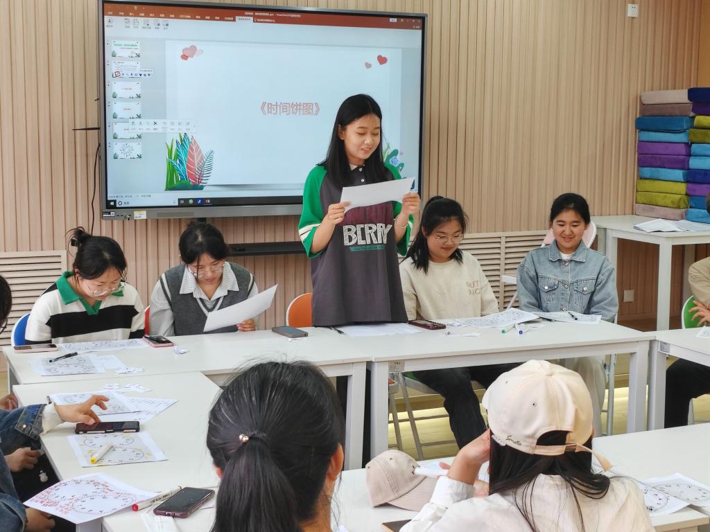 本次团体心理辅导工作坊采用团体游戏沉浸式体验的方式开展。活动共分为四个部分,在破冰环节,通过绕圈发言和团体游戏的方式彼此相识,在欢声笑语中表达自我。在“一分钟的价值”环节中,通过小组头脑风暴的方式,发现更多一分钟能做的事,认识到每一分钟都有价值。在“时间分割”环节,在时间纸条上标记一天的时间安排,通过撕纸条的方式,发现目前时间安排存在的问题。在“时间饼图”环节,成员根据自身实际绘制“24小时时间管理饼图”,通过互相分享和讨论,更直观地促进学生理性反思自己的时间安排。