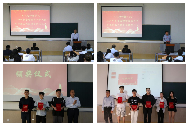 会议播放了该院参加学校2024年度春季田径运动会纪录片;举行了颁奖仪式,学院领导为优秀运动员、优秀教练员、优秀志愿者、优秀方队队员、宣传先进个人颁发了证书;举行了聘任仪式,李芬代表学院向受邀担任体测工作指导员的体育学院学生颁发了聘书。