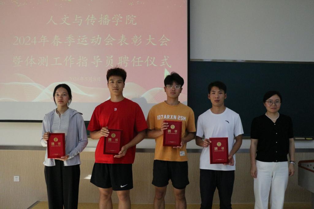 5月8日下午,人文与传播学院在2B102举办2024年度春季田径运动会总结表彰大会暨体测工作指导员聘任仪式。该院党委书记朱桂林、党委副书记岳现超、副院长李芬、各年级辅导员及全体运动员、运动会各工作组成员参加。大会由该院团委副书记张甜主持。
