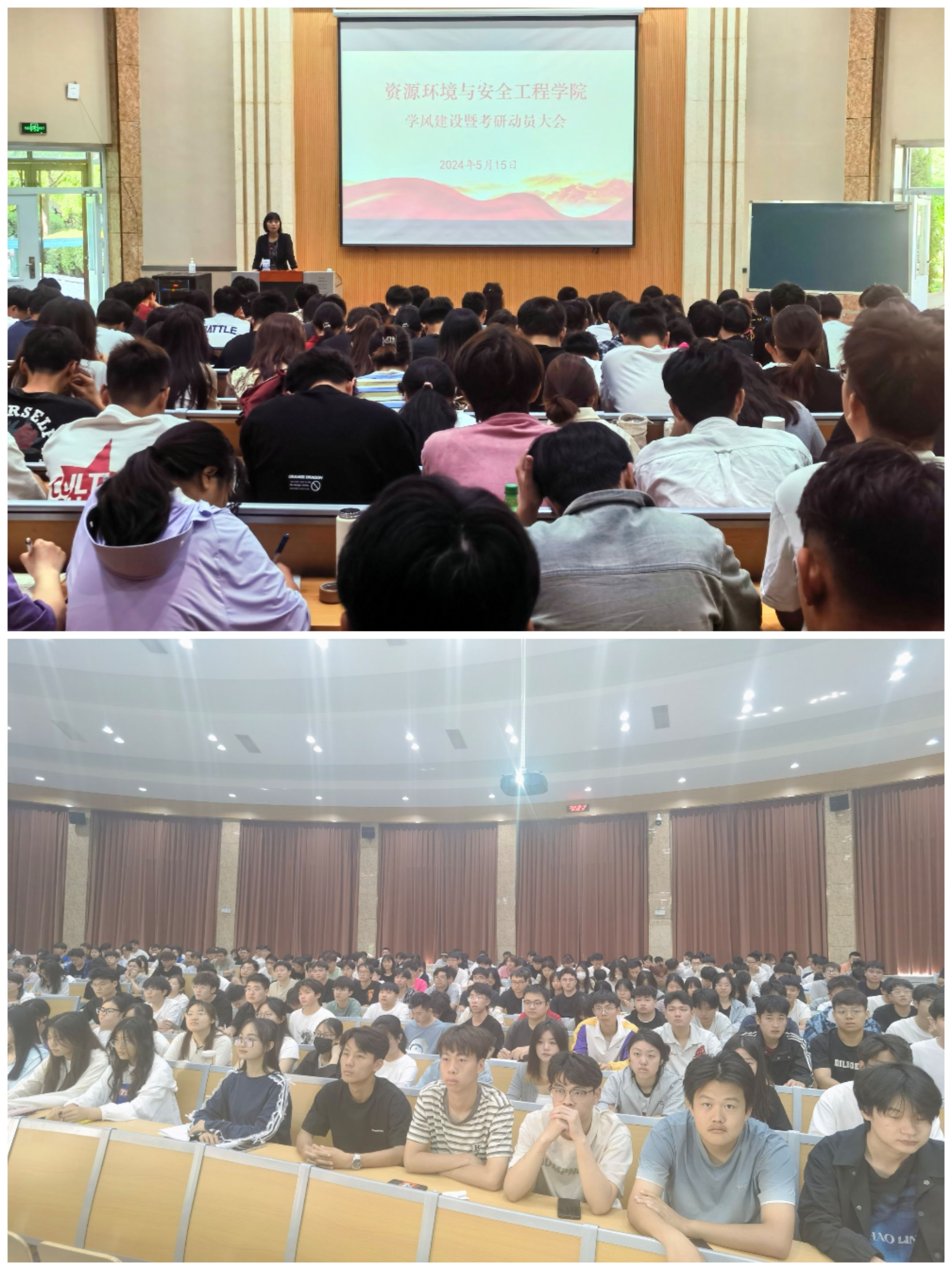 为推进学风建设,激发考研热情,5月15日,资源环境与安全工程学院在8号楼报告厅召开学风建设暨考研动员大会,该院党委书记唐秋晶、院长程杰,副书记许言强、副院长武泉林、全体辅导员、2025届毕业生、全体学生干部参会,会议由辅导员贾艳丽主持。