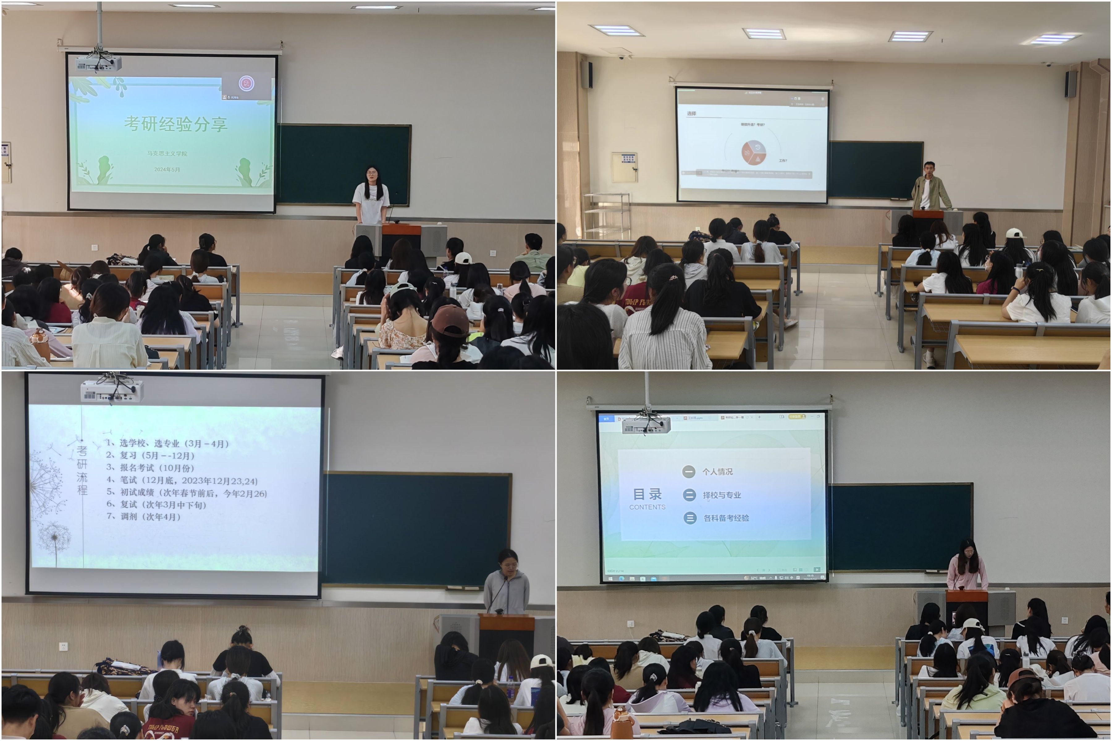 正式录取15人中,多人被陕西师范大学、江南大学等双一流高校录取,以及山东师范大学、哈尔滨师范大学等全国重点马院录取。录取同学结合自身的考研经历,从不同的角度围绕院校专业挑选、科目复习方法、时间规划技巧、心态调适建议、资料收集整理等多个方面,逐一为同学们详细讲解,提供了非常有价值的参考,帮助同学们打破信息差。分享结束后,与会学生纷纷表示受益匪浅,将以这些优秀的学长学姐为榜样,扎实学习,争取在未来的升学中取得良好成绩。