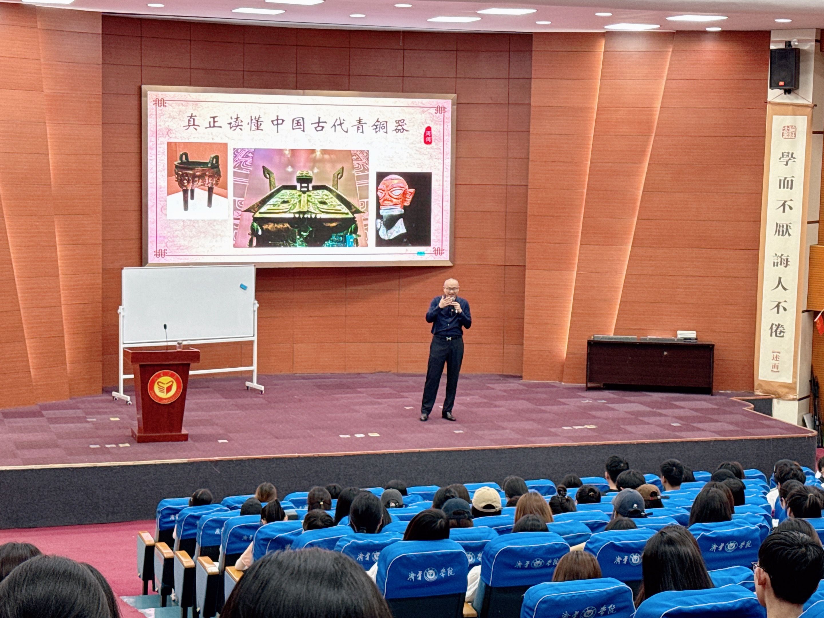 为进一步加强文化遗产保护传承,弘扬中华优秀传统文化,扩展学生的人文艺术领域知识,5月16日下午,经济管理学院在理科楼成功举办了文旅讲堂“真正读懂中国古代青铜器”。本次讲堂周倜主讲,周倜是工程技术应用研究员,科技部创新创业领军人才,全国科技成果评价专家库专家,中国科学院大学专业型硕士导师,济宁学院特聘教授,兼任中国文物学会青铜器专业委员会理事,山东省古玩商会副会长。讲堂由旅游管理专业教研室主任赵月阳主持,300余名学子共同参加。