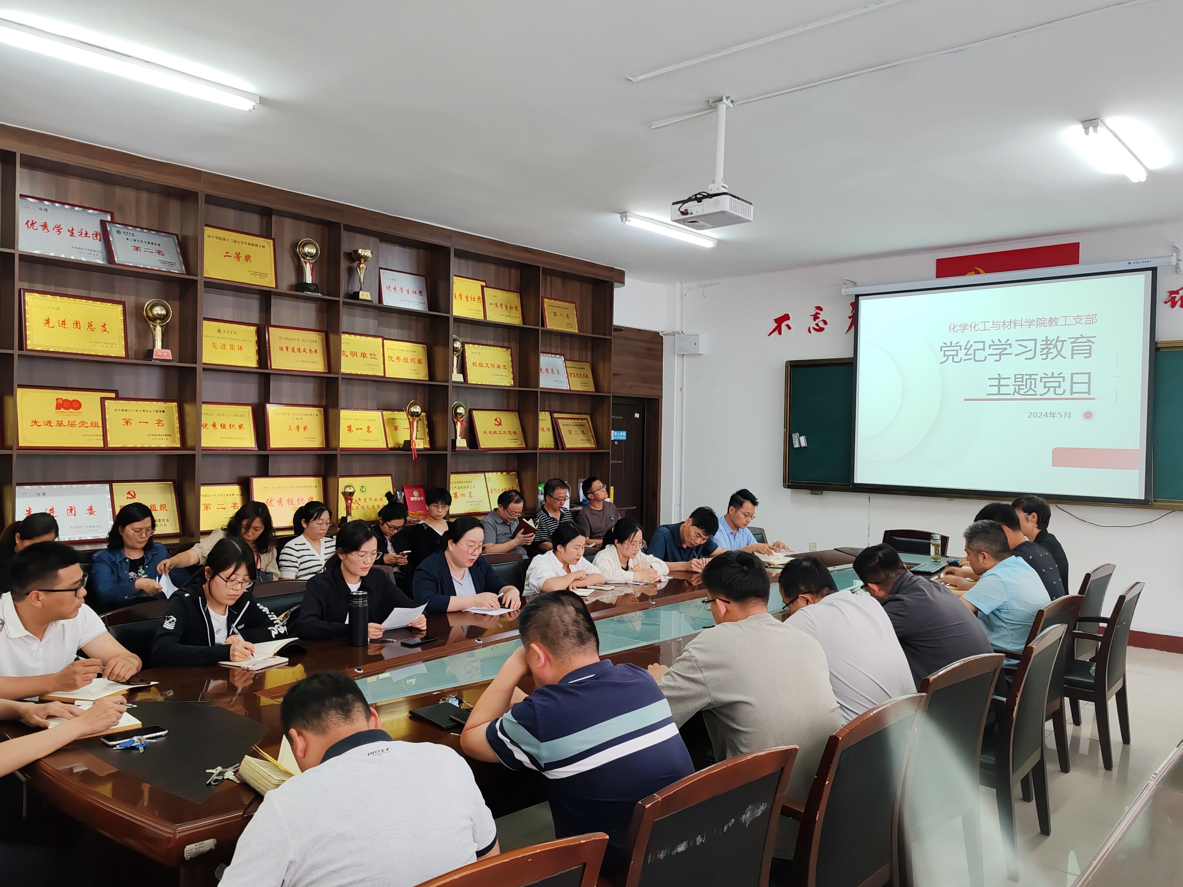为扎实开展党纪学习教育,5月16日下午,化学化工与材料学院教工党支部在学院会议室开展党纪学习教育主题党日活动。全体党员教工参加活动,会议由教工党支部书记袁宽瑜主持。