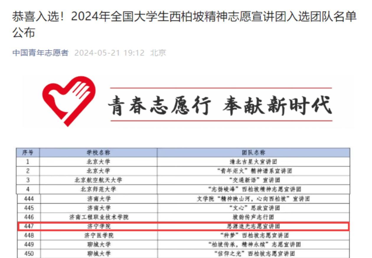 近日,由团中央青年志愿者行动指导中心、中国青年志愿者协会秘书处等部门单位联合开展的2024年全国大学生西柏坡精神志愿宣讲活动面向全国高校招募宣讲团队,马克思主义学院付茹雪老师指导、胡江涛等学生组成的“思源追光”志愿宣讲团成功入选。