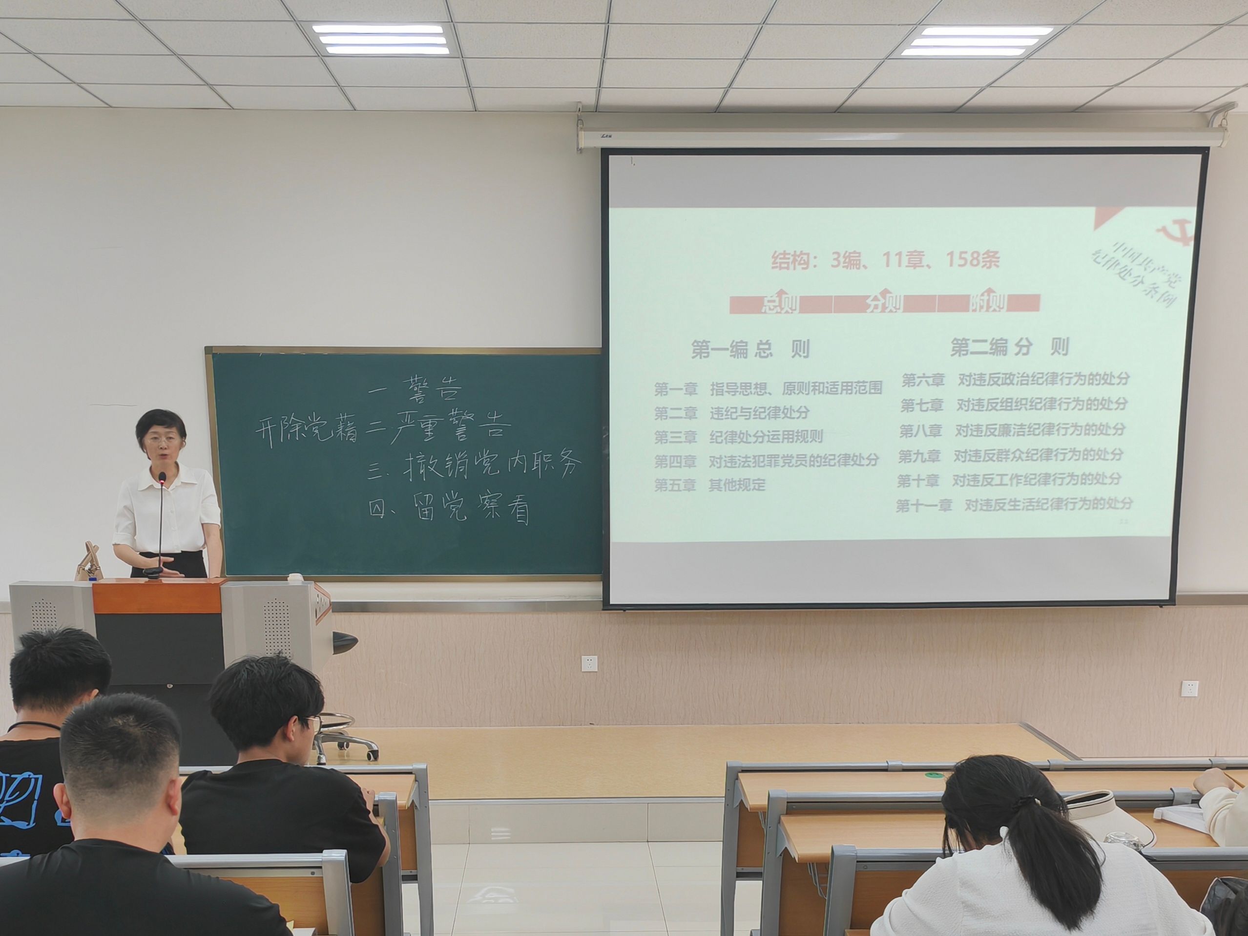 马新蕾为参训学生详细梳理2024年《条例》的基本框架,解读此次修订的主要内容、修订的亮点以及新版《条例》对于推动全面从严治党向纵深发展的重要意义。她指出,《条例》是党的纪律的基础性法规,内容丰富、涉及面广、针对性强,同各级党组织和每一名党员息息相关。她强调,无论是入党积极分子还是发展对象,要认认真真、原原本本学习《条例》,将纪律挺在前面,做到学纪、知纪、明纪、守纪,对照《条例》要求,进一步端正入党动机,规范个人言行。尤其特别要做到在思想上入党,严格遵守党的政治纪律,深刻领悟“两个确立”的决定性意义、自觉增强“四个意识”、坚定“四个自信”、做到“两个维护”,更加紧密地团结在以习近平同志为核心的党中央周围。作为学生还应该把《条例》学习与校纪校规的学习结合起来,始终在遵规守纪方面走在前、做表率。